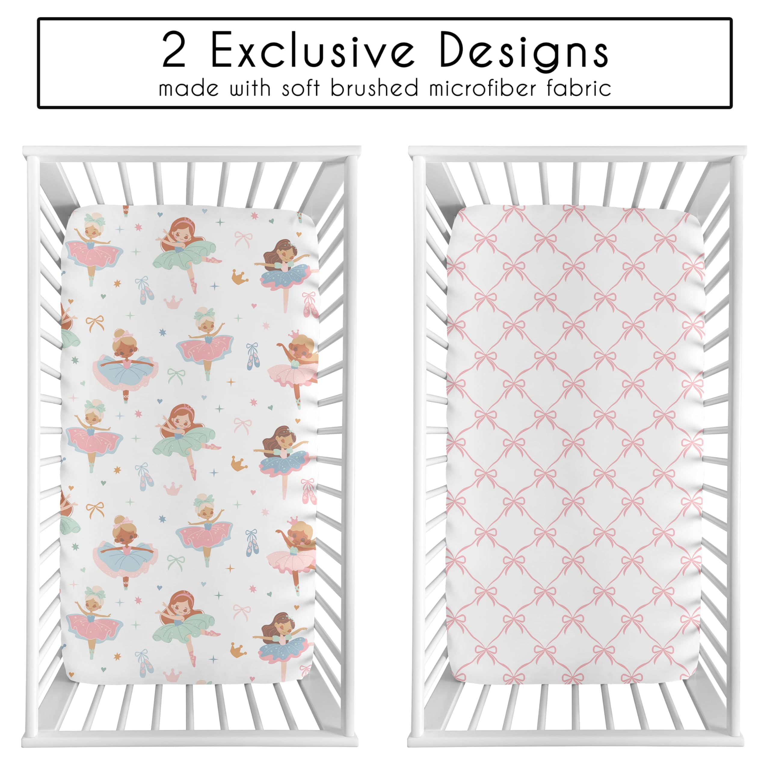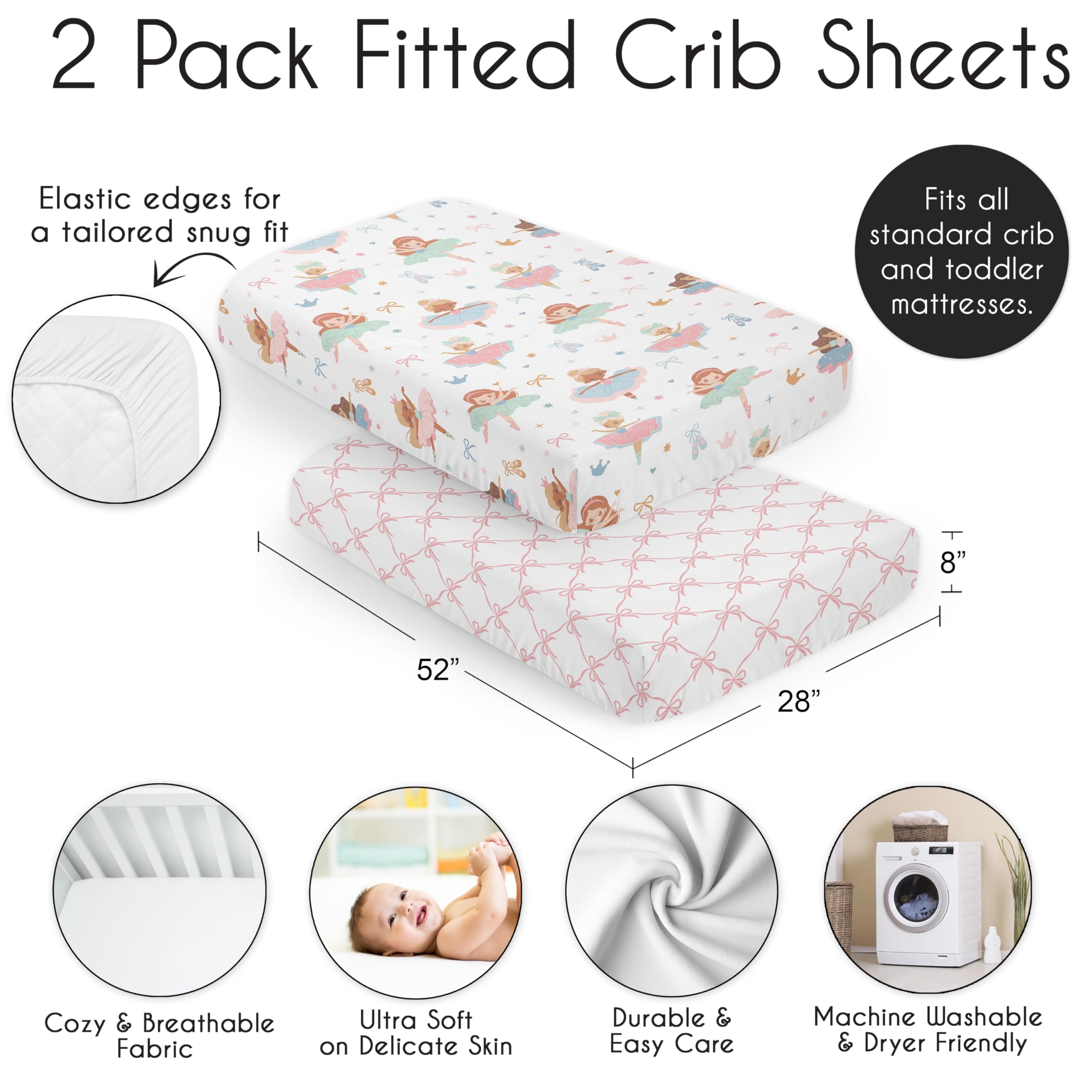 SNUG FIT: Includes: (2) Baby Crib Sheets: 52in. x 28in. x 8in. Our newborn standard crib sheets fit snugly, with premium elastic sewn around the entire bottom edge for a secure fit on most standard sized cribs & toddler beds, to reduce shifting & bunching. This microfiber cribsheets set features an exclusive design of a pink & white bows print paired with a blush & white shabby chic, ballerina, ballet dancer, princess bow print & is gentle on delicate skin to foster a soothing sleep environment.
