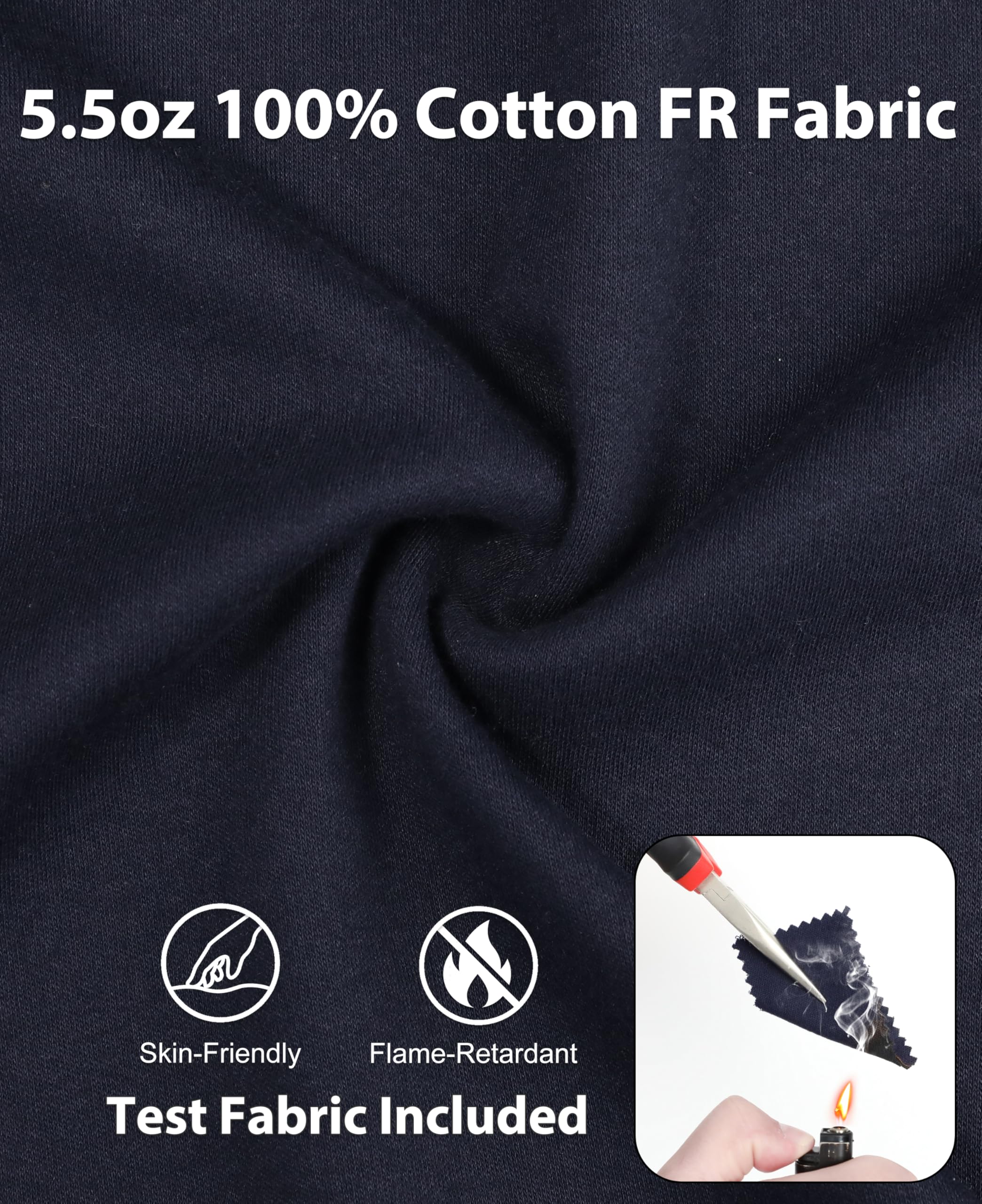 FR MATRIALS:5.5OZ cotton knit FR treated,FR buttons,FR sewing threads!Clear FR tag on arms and bottom front.