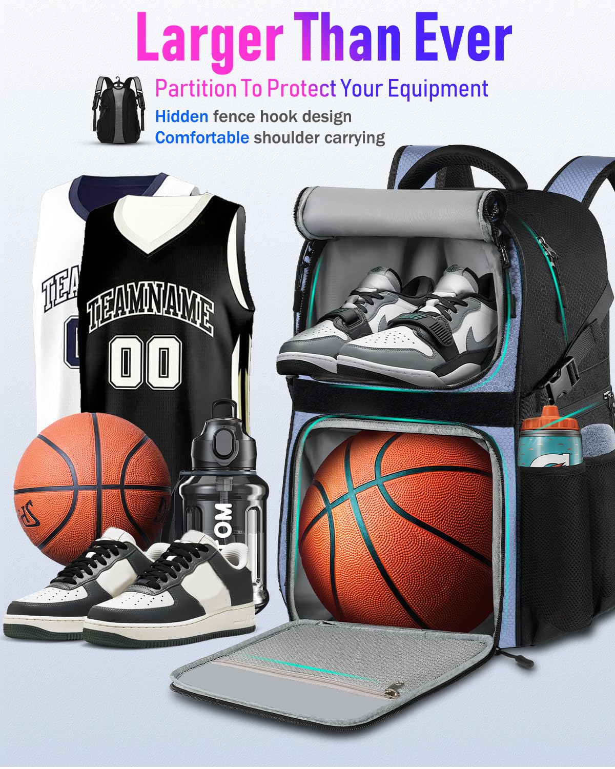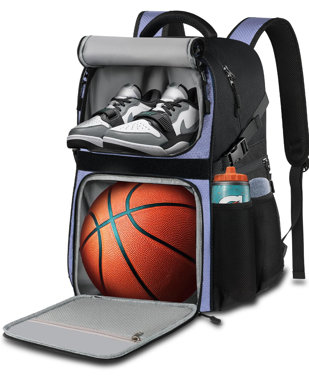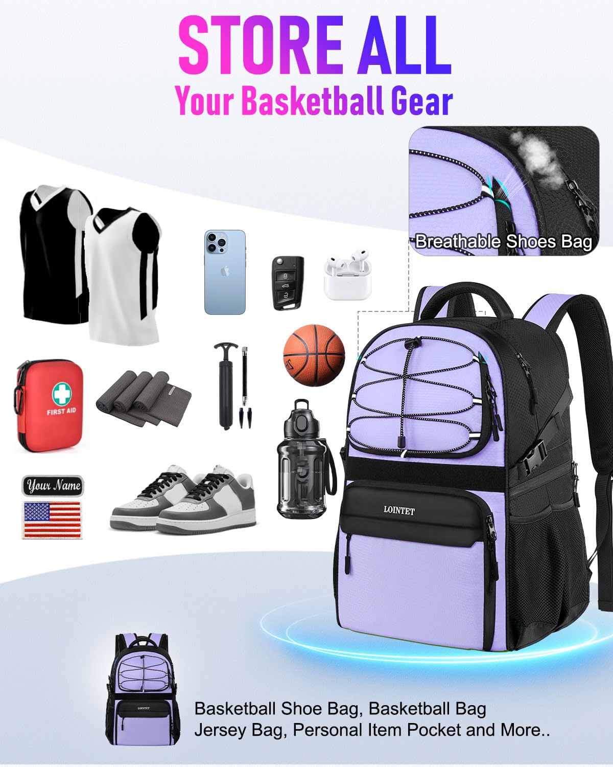 More Space Than Ever Before: LOINTET basketball bag backpack can easily carry your basketball equipment. Equipped with 11 storage compartments basketball backpack: 1 special compartment for your basketball, 1 main compartment for your clothes, 1 breathable compartment for your basketball shoes, 4 side mesh pockets for your water bottle, towel, first aid tools, air pump and other equipment. Additional 4 hidden zipper pockets can store your phone, headphones and other valuables