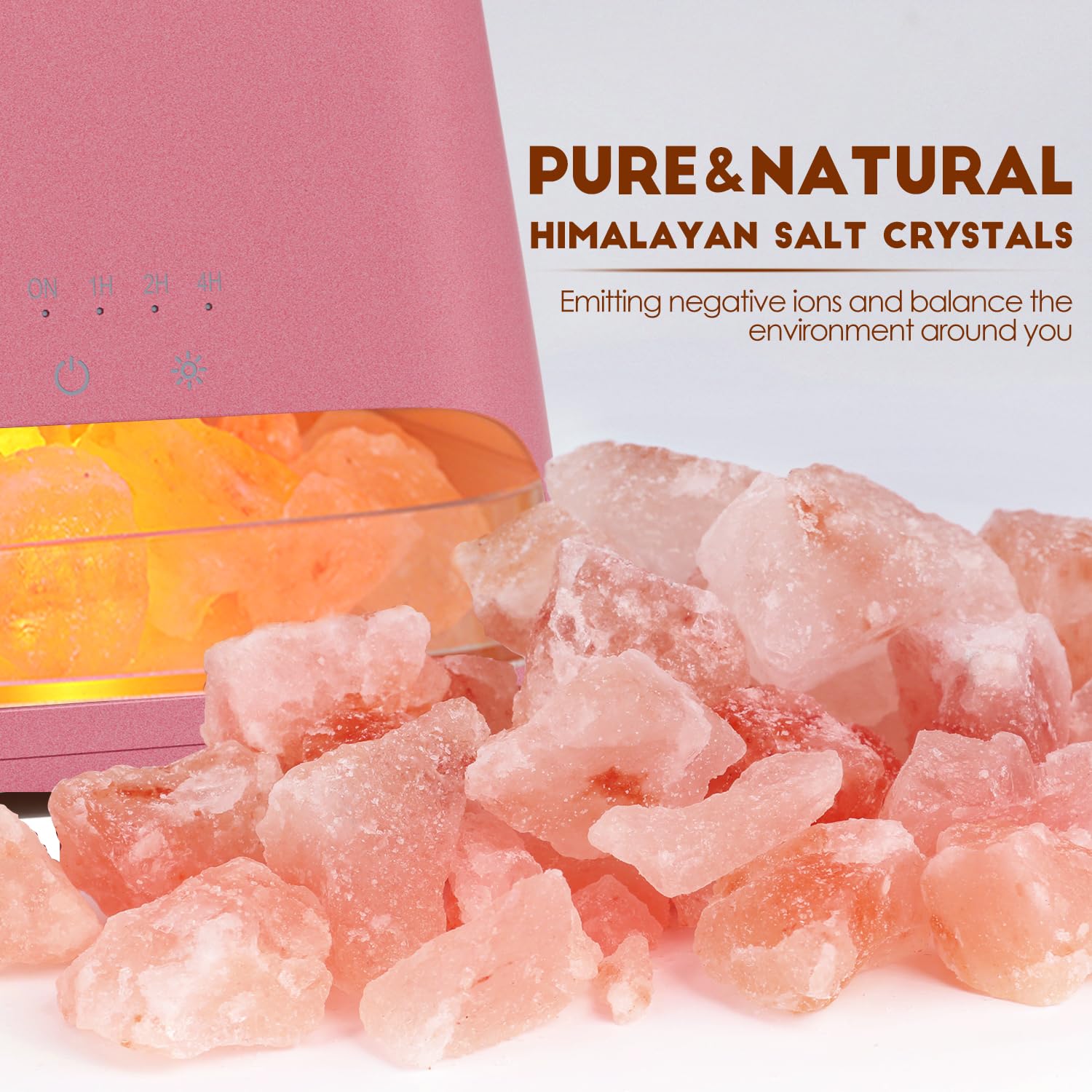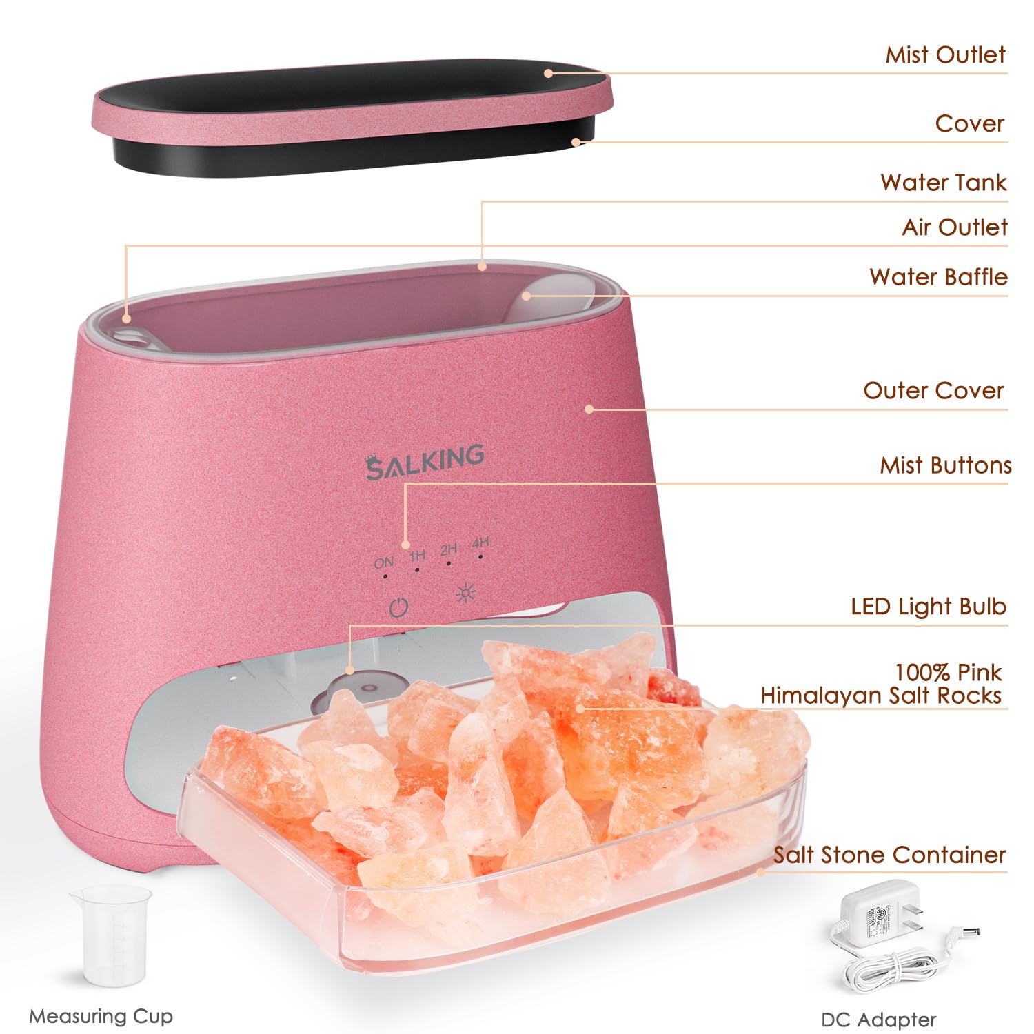 SALKING 2-in-1 Ultrasonic Essential Oil Diffuser & Himalayan Salt Lamp The 150ml Ultrasonic Aroma Diffuser with Himalayan Salt Rock Lamp, combines the therapeutic properties of a pure Himalayan salt lamp with the soothing aromatherapy of an essential oil diffuser. Waterless automatic shut-off safety system: Essential oils humidifier with a stable and reliable safety system, when the water is lower than the tank, it will turn off automatically. Whisper Quiet: It makes virtually zero noise while operating and refresh in rooms of 20-25m². essential oil diffuser for room almost silent, it won't interfere with your sleep. Timer: You can easily press the Timer Button to choose a timer setting as your wishes (ON/1H/2H/4H),and this aroma diffuser can run up to 8 hours of continuous output. Three Adjustable Lamp Levels: Strong, Breath, Weak. Touch senstive control button brings you high-tech feeling. b>Technical Specifications: Water sink capacity: 150ml Material: PP/ABS/PC/Himalayan Salt Rock Noise Level: less than 20dB Most advanced ultrasonic technology: 2.4MHZ Package Contents: 1 x Aroma Diffuser 1 x Measuring Cup 1 x Charger Adaptor 1 x Pure Himalayan Salt Rock 1 x User Manual