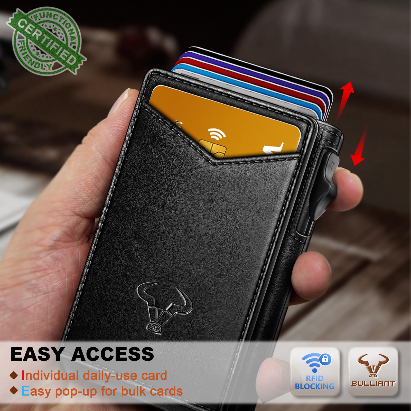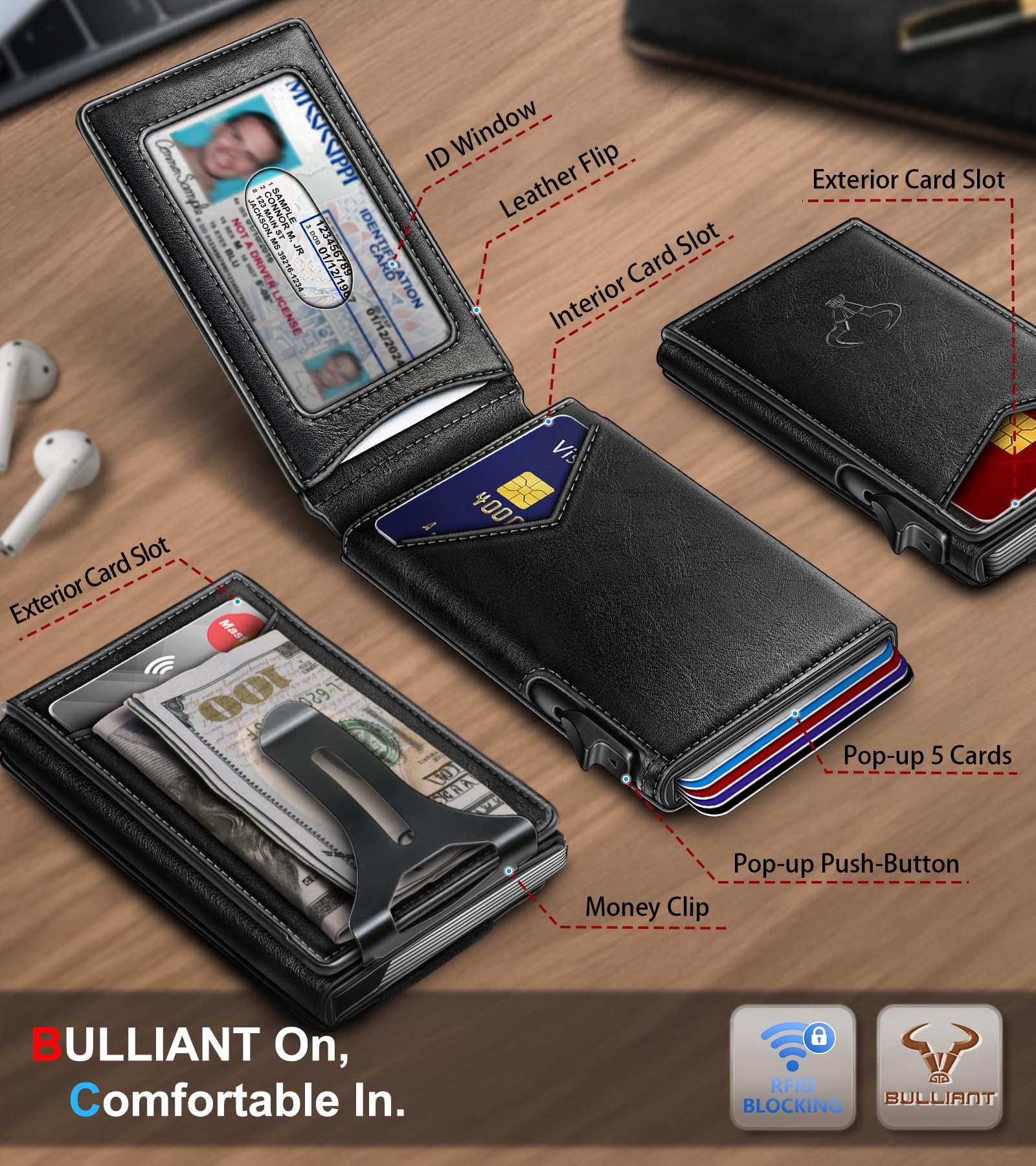 CAPACITY-Pop-up metal Case in flipping leather shell,9 card slots (including 1 ID window) and metal money clip for couple of bills;