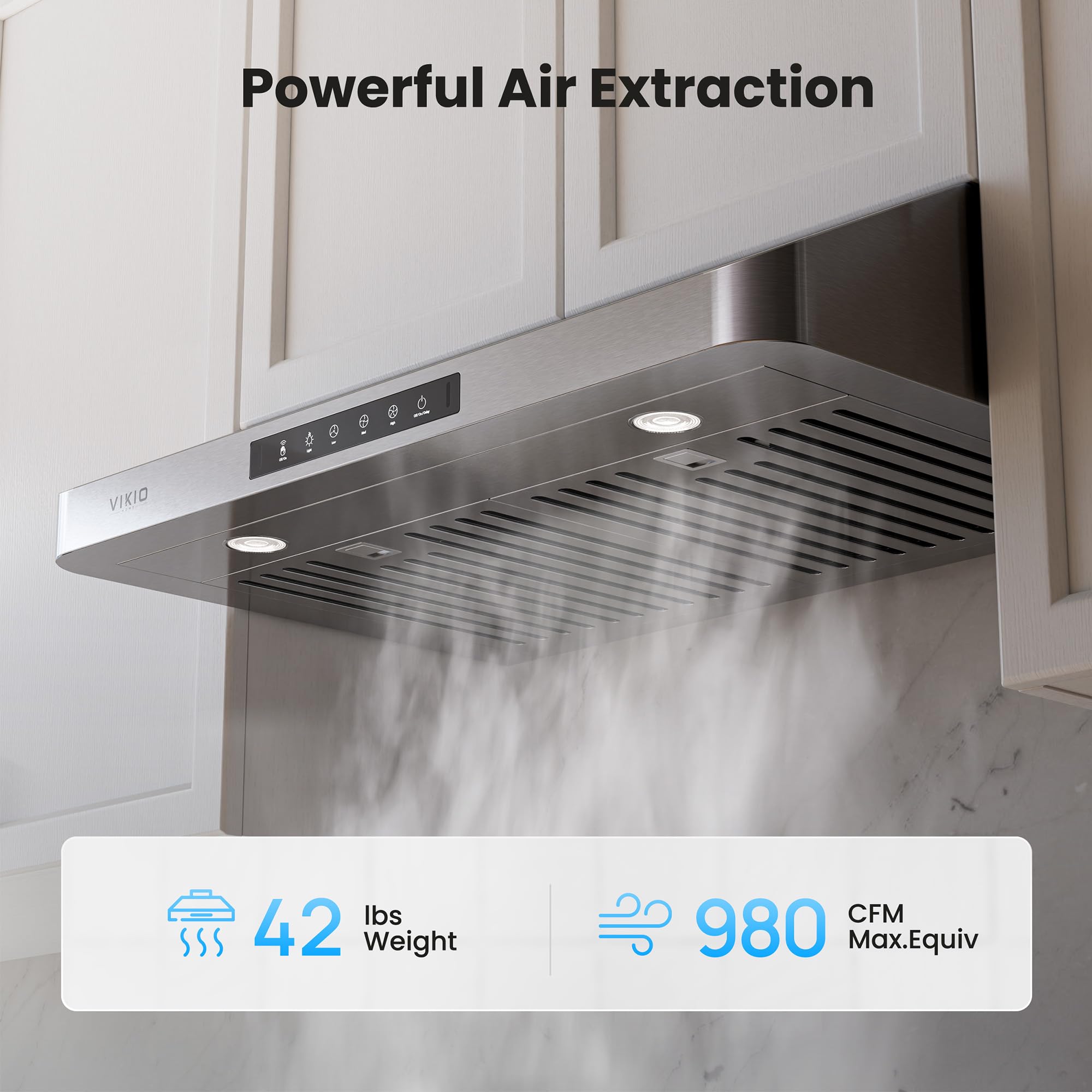 [Independent Duct + Upgraded Motor + 980 CFM] This 42" kitchen hood features an enhanced motor and independent volute design, delivering 30% stronger suction than traditional models. It refreshes the air in a 180 sq ft kitchen every 90 seconds, quickly removing smoke, grease, and odors. Ideal for heavy-duty cooking like stir-frying or frying.