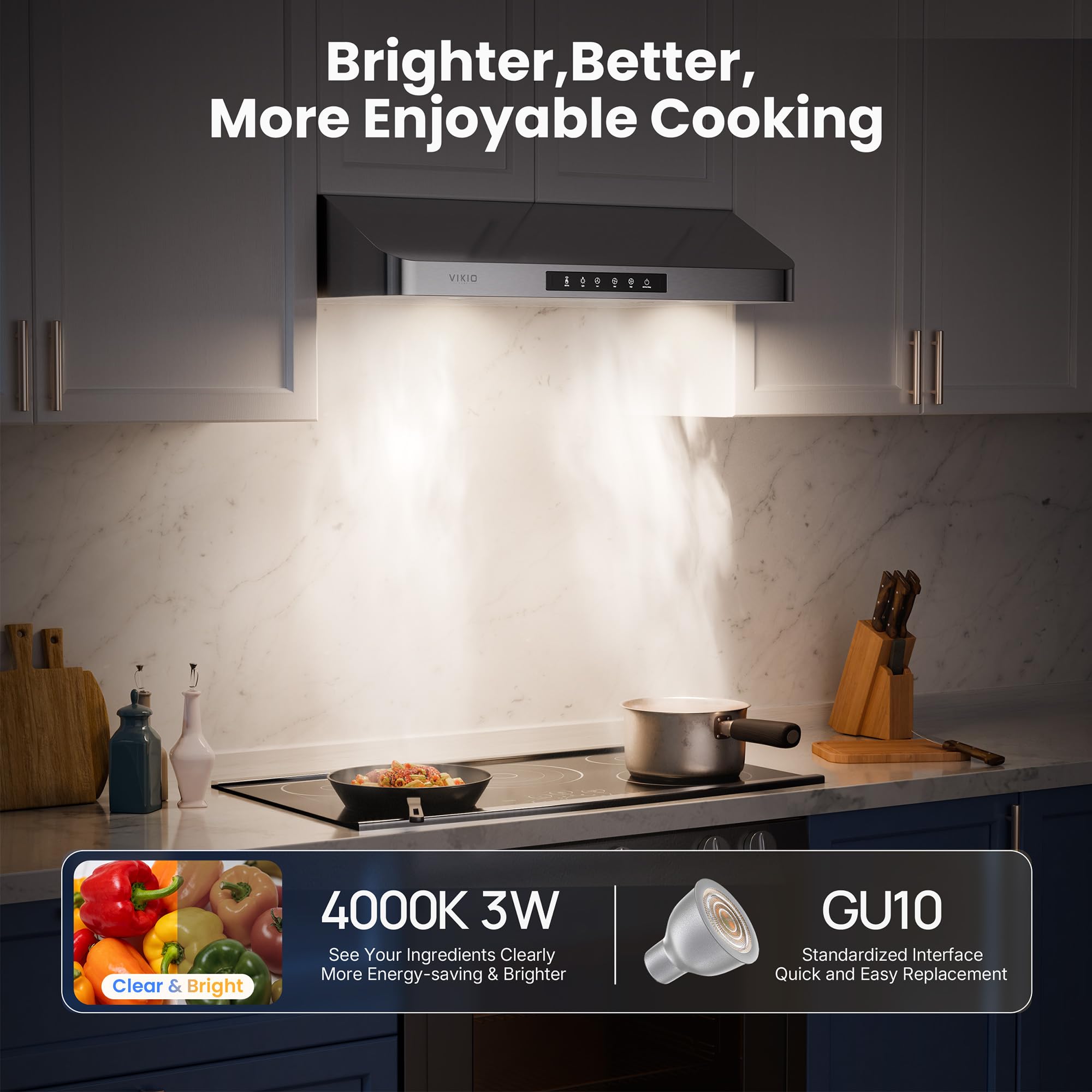 [Bright Lighting + Easy Replacement + Energy Efficient] This under cabinet range hood uses standard GU10 bulbs that are easy to replace. Energy-efficient LED options can reduce energy consumption by up to 30%. With DIY replacement in just one minute, it saves power, time, and cost.