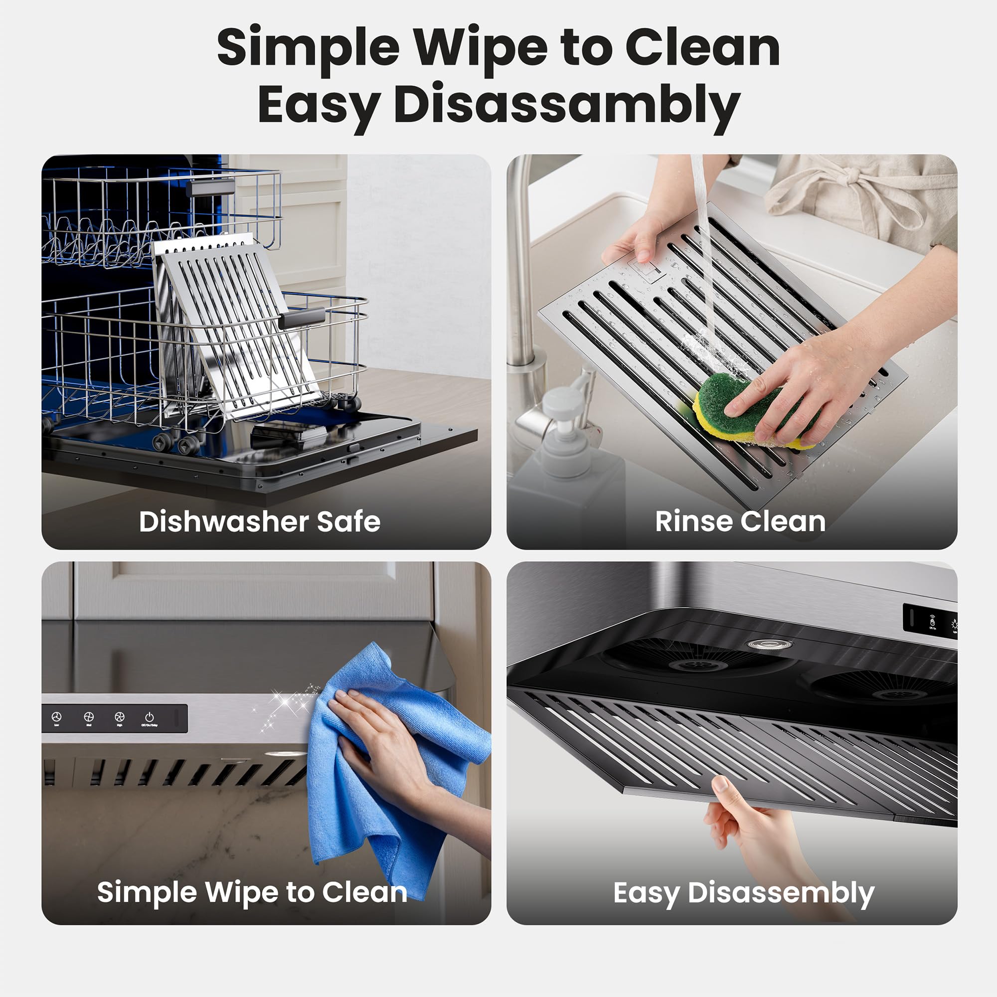 [Stainless Steel + Durable + Fingerprint-Resistant] This under cabinet stove hood is built with commercial-grade stainless steel and widened filters for long-lasting durability and efficient grease capture. Ideal for busy households, it is smudge-proof and fingerprint-resistant for easy cleaning, extending its service life to 10+ years.