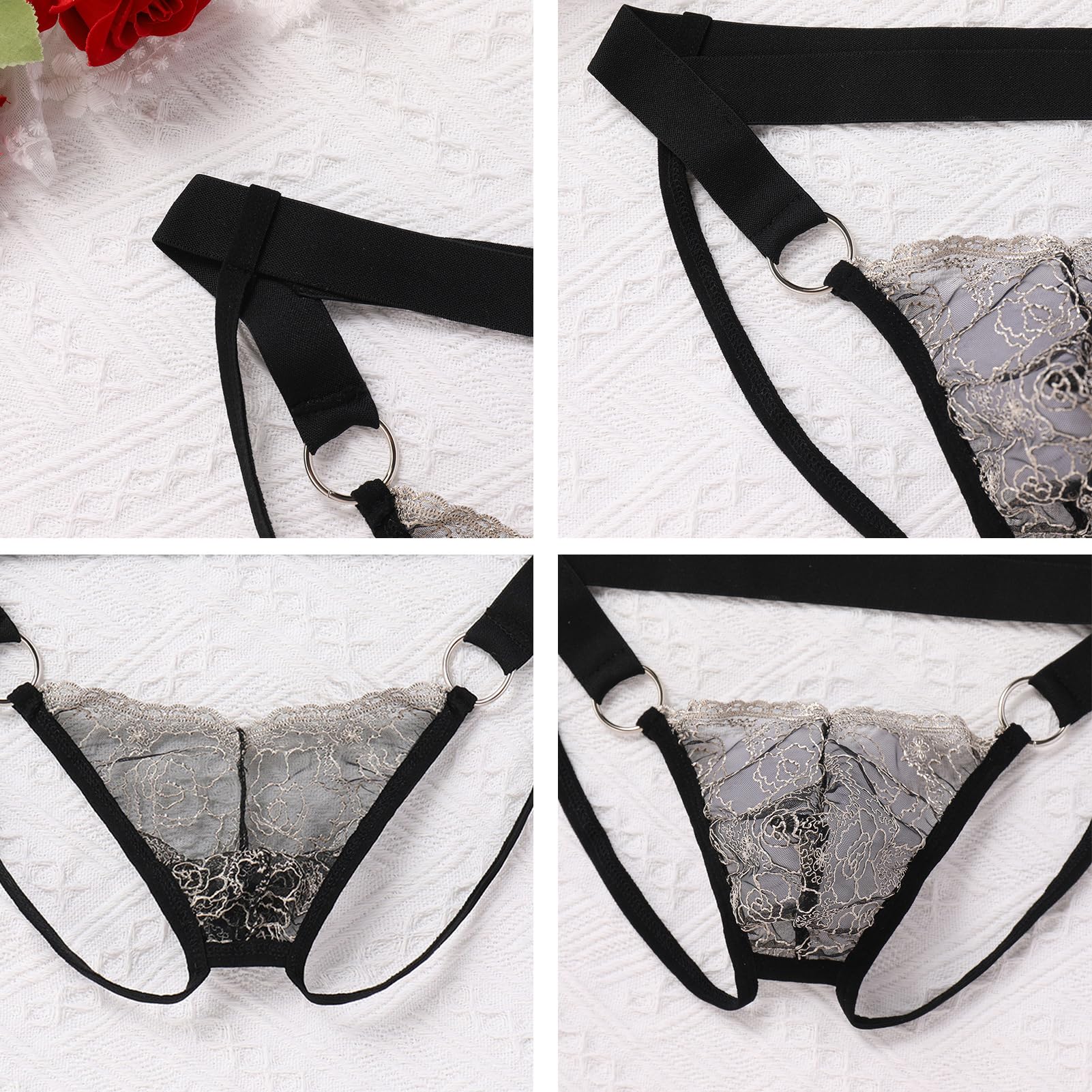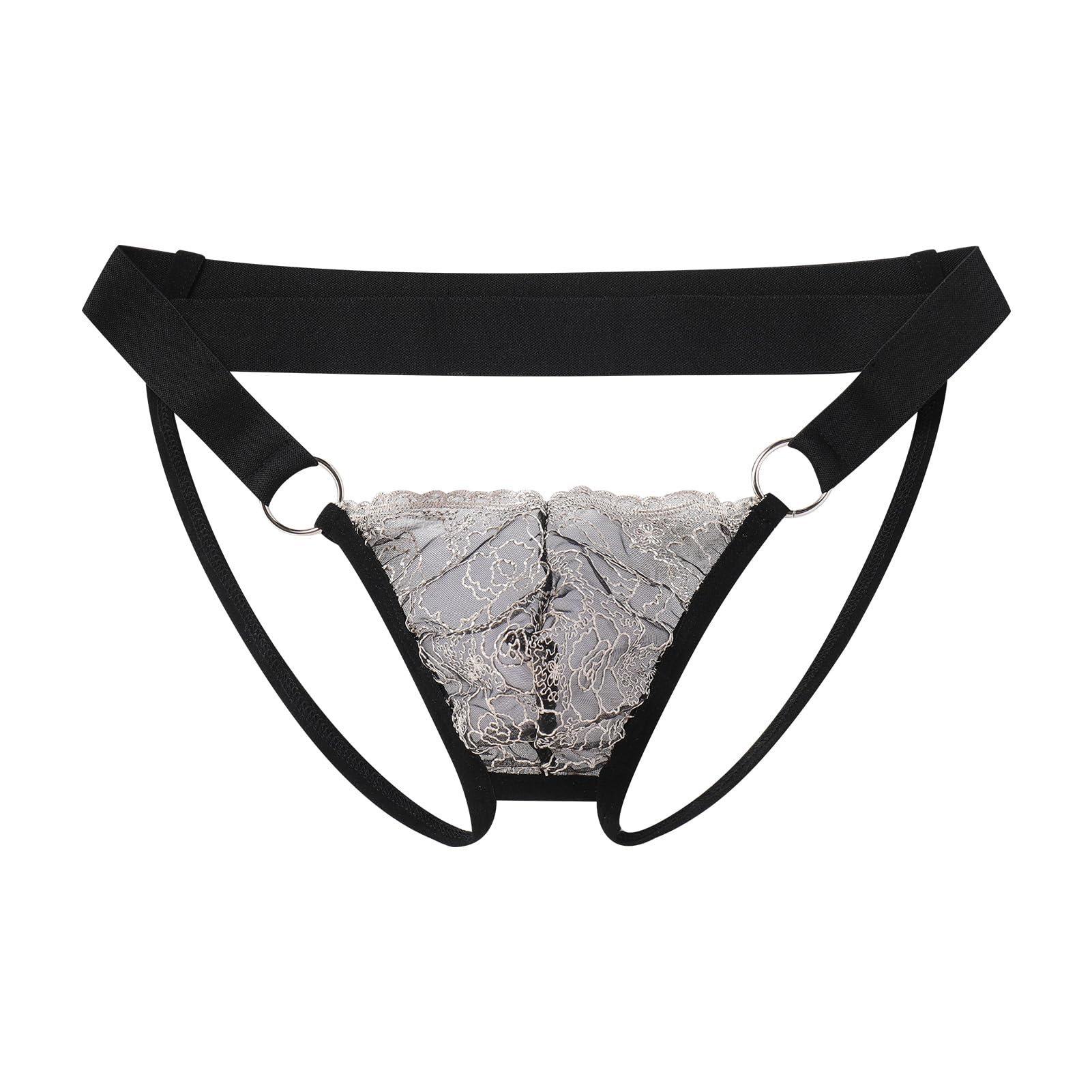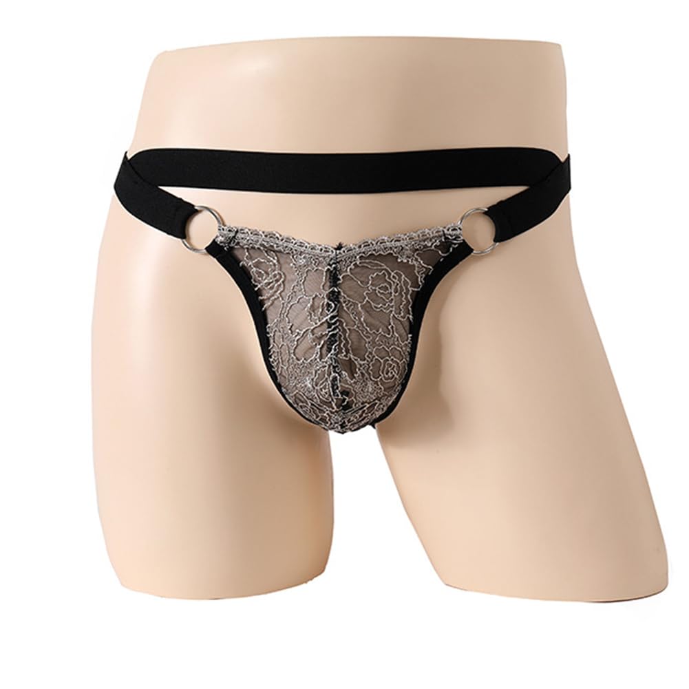 Design: Men's lace thong underwear mens sissy panties lingerie, low rise sissy panties, sheer lace pouch design, floral lace pattern, sheer see through,low waist sissy pouch panties for men, elastic waistband, strappy cut out design, with metal rings, sissy thong underwear for men.