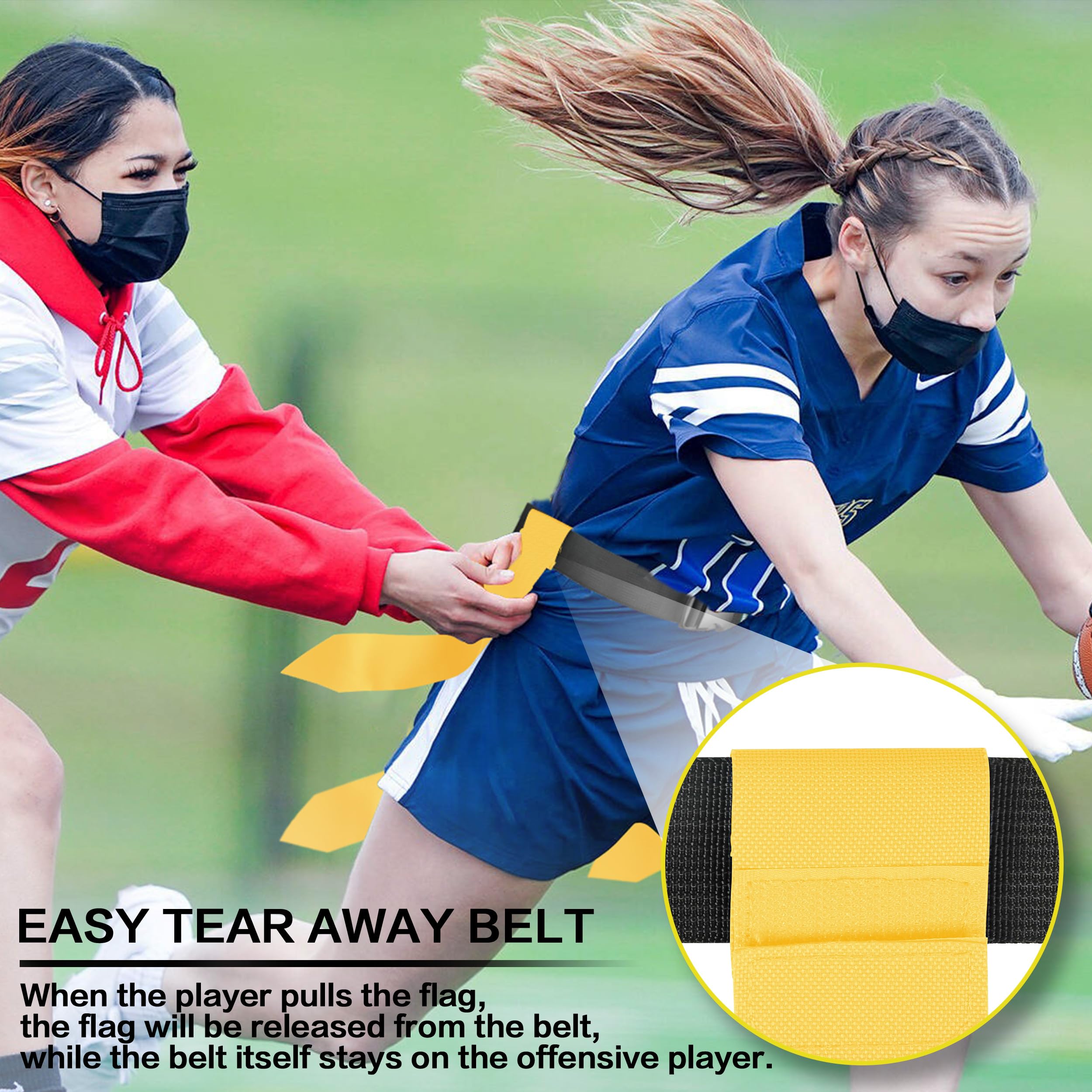 Each flag belt has three detachable flag tags that are held to the belt with hook and loop. When the defensive player pulls the flag, the flag will be released from the belt, while the belt itself stays on the offensive player