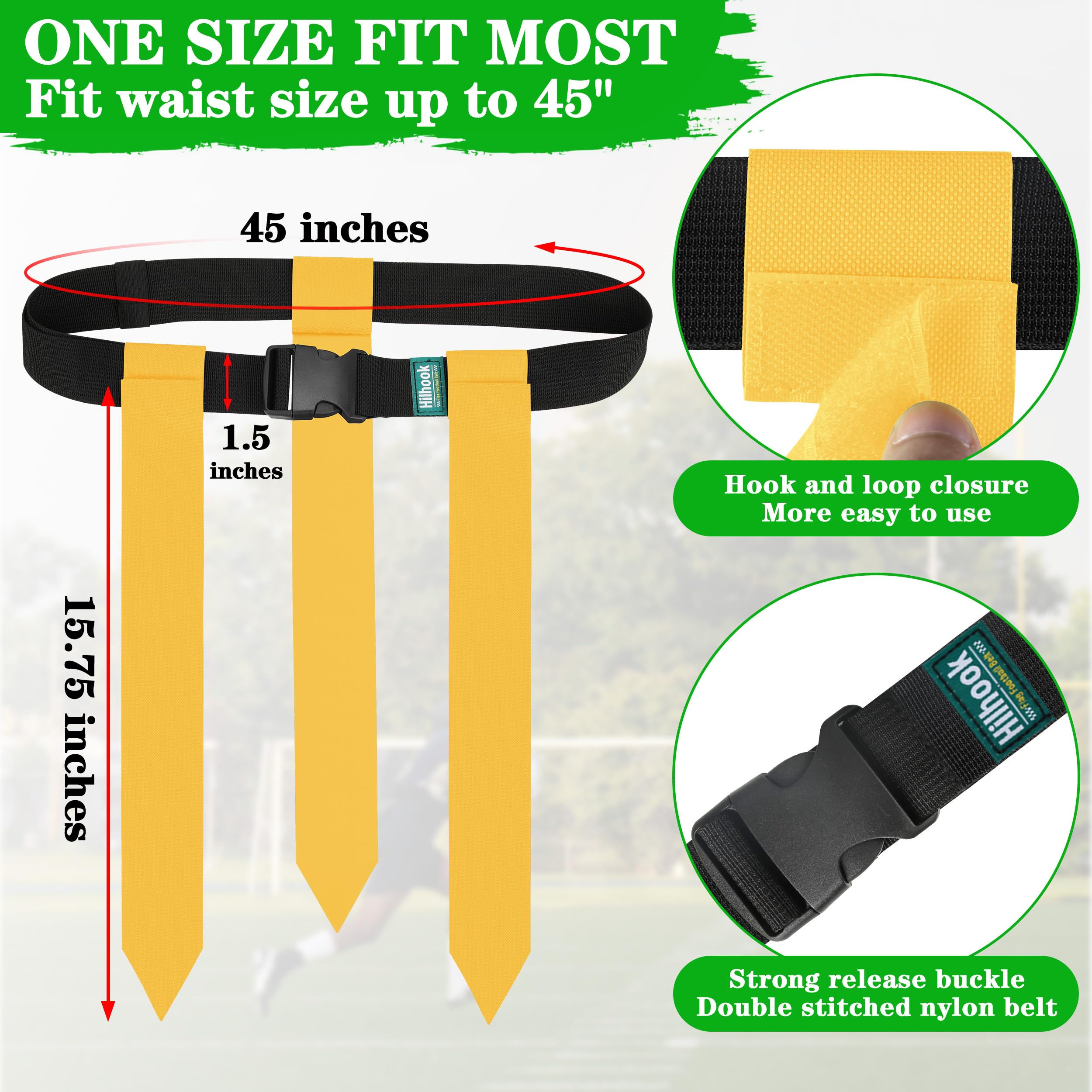 Flag belts is 45 inches long and 1.57 inches wide that can be adjusted to fit most waist sizes. Suitable for players of most sizes in body shape, such as kids, women, men, teenagers and more