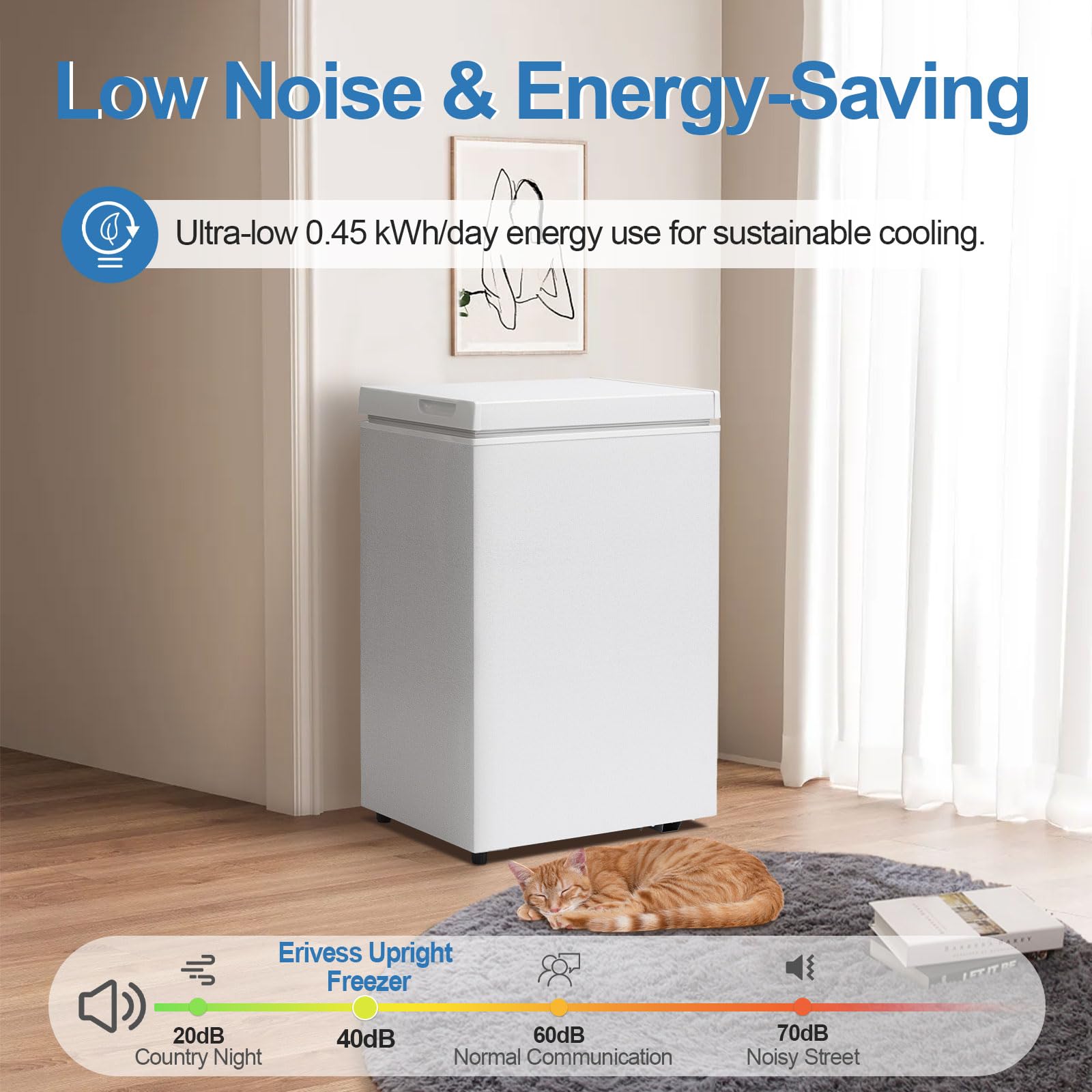 【Energy-Saving Freezer Performance】Our compact freezer consumes just 0.45 kWh/day, making it one of the most efficient small freezers available. The whisper-quiet 40dB deep freezer operation won't disrupt your home office or bedroom. Its high-efficiency compressor outperforms standard garage freezers.