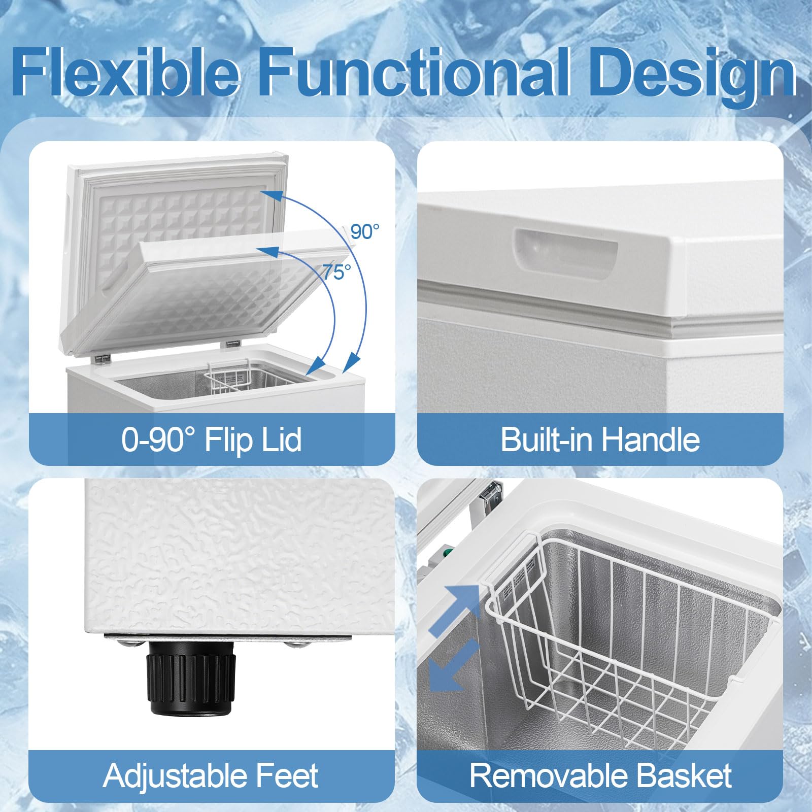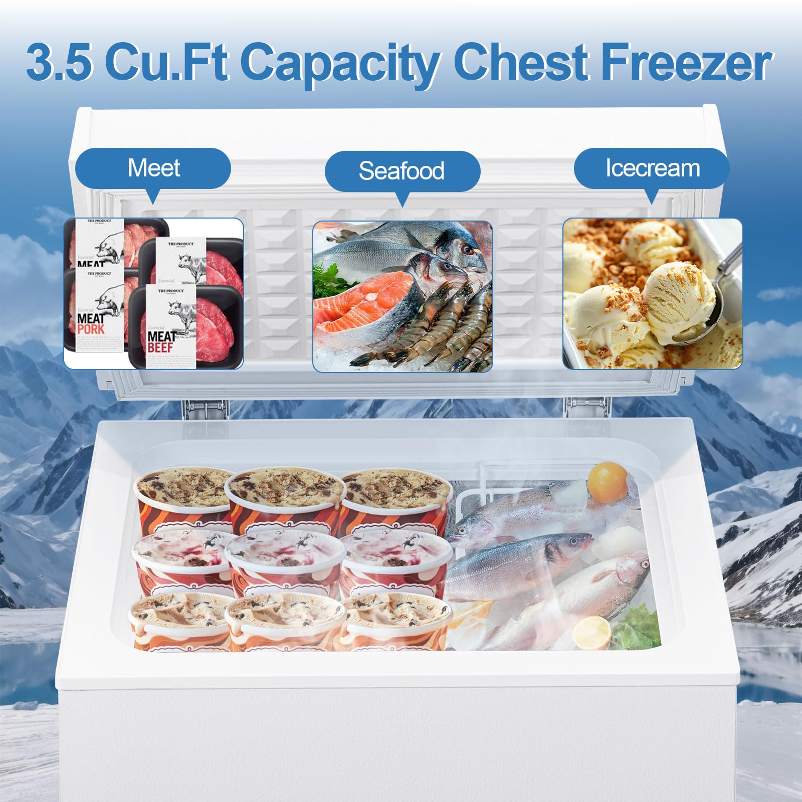 【Compact Chest Freezer Design】This 3.5 cu.ft small deep freezer fits perfectly in compact spaces like apartments, dorms and RVs. The energy-saving mini freezer features a 0-90° flip lid with built-in handle for easy access. Its space-saving white chest freezer design complements any kitchen or garage decor.