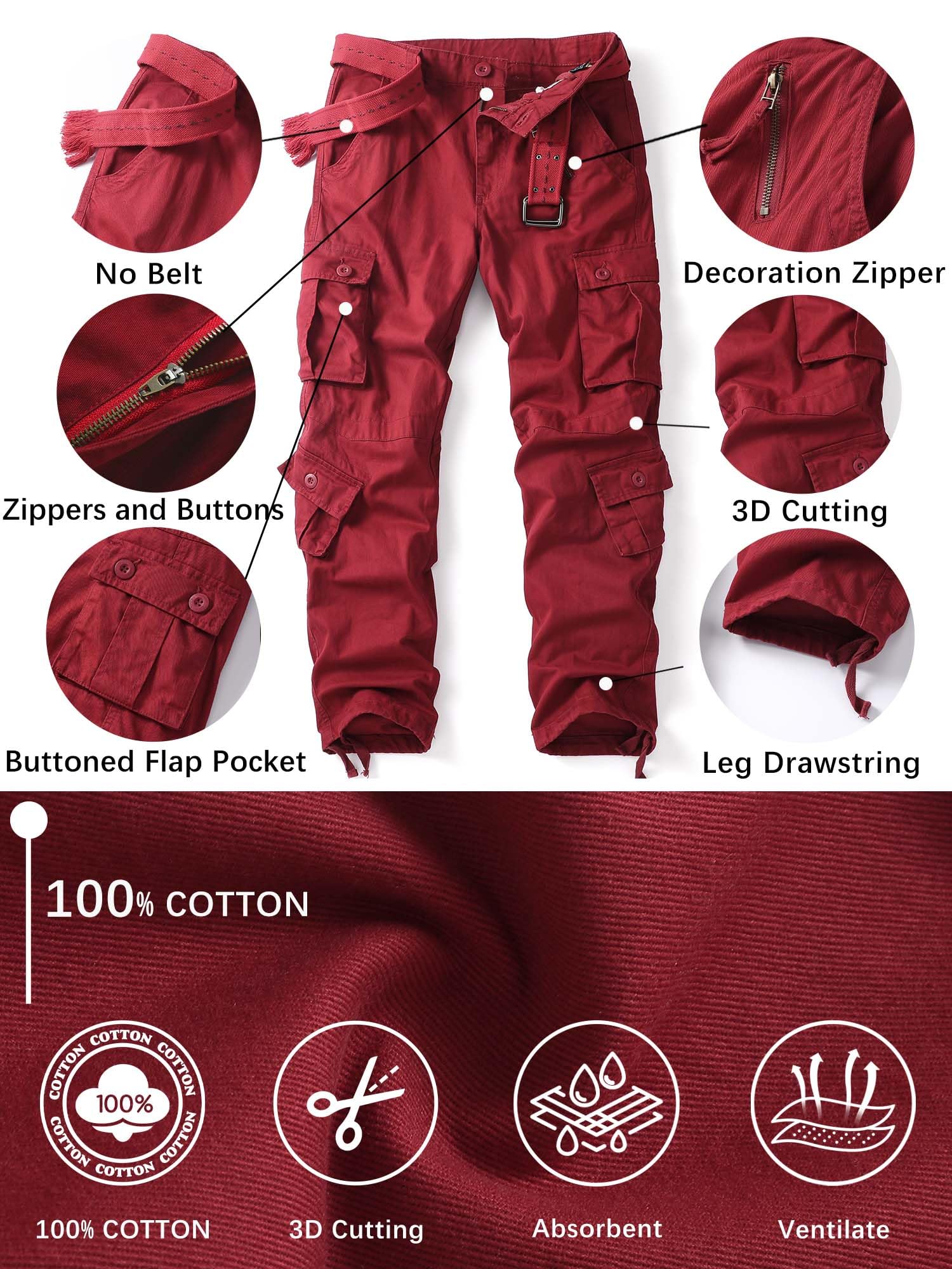 Product Material:This cargo pants for men use 100% cotton fabric, treated for ease of care with a wrinkle-resistant finish and durability,which is soft,breathable and sweat-absorbent,durable and tough,can repel the stains, liquids and soil keep you all day dry and clean.