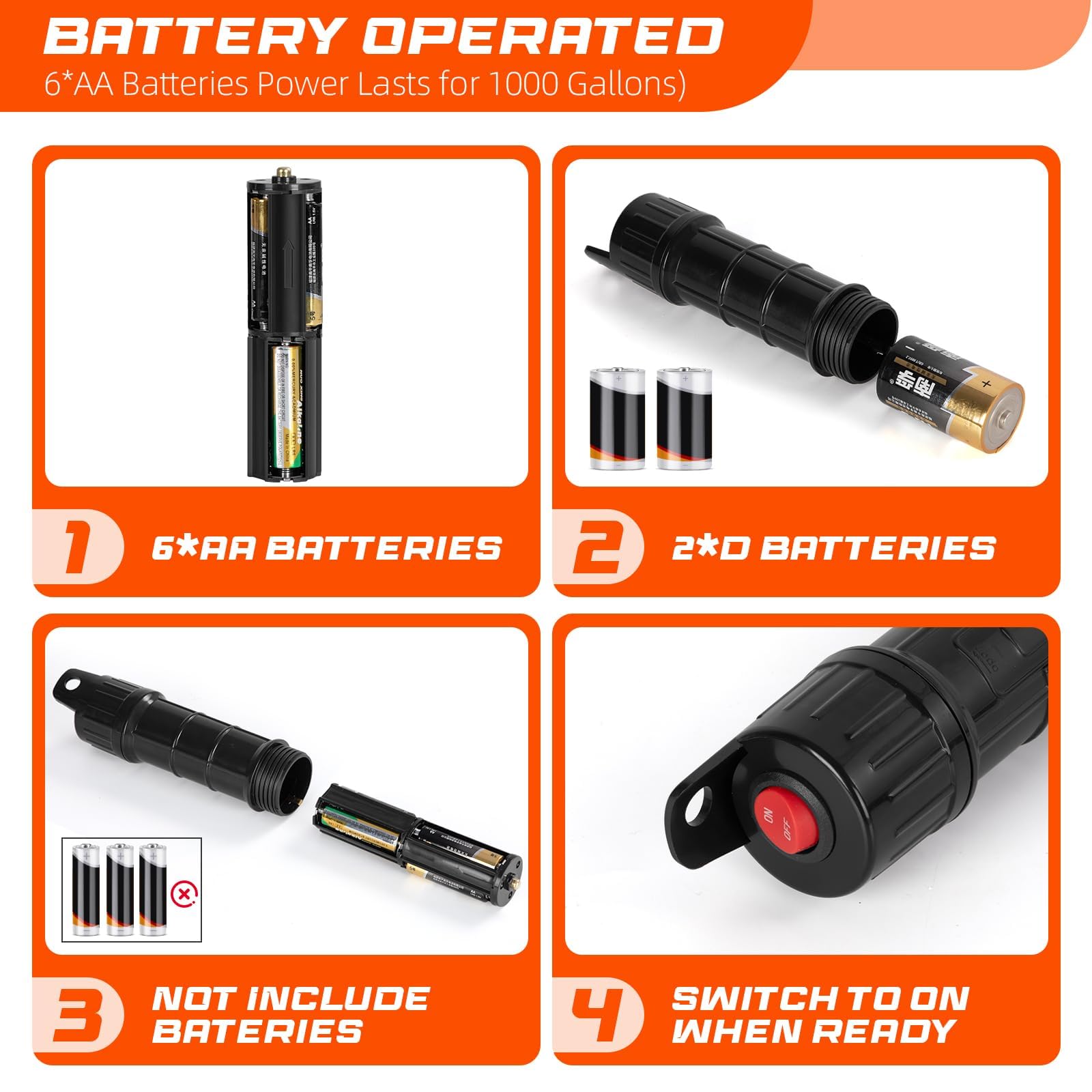 【Battery Powered Water Pump】: Liquid transfer pump features a battery-operated, making it convenient and practical for outdoor activities or emergency situations , ideal if power is unavailable. Requires 2 D Cell batteries or 6 AA batteries(not included).
