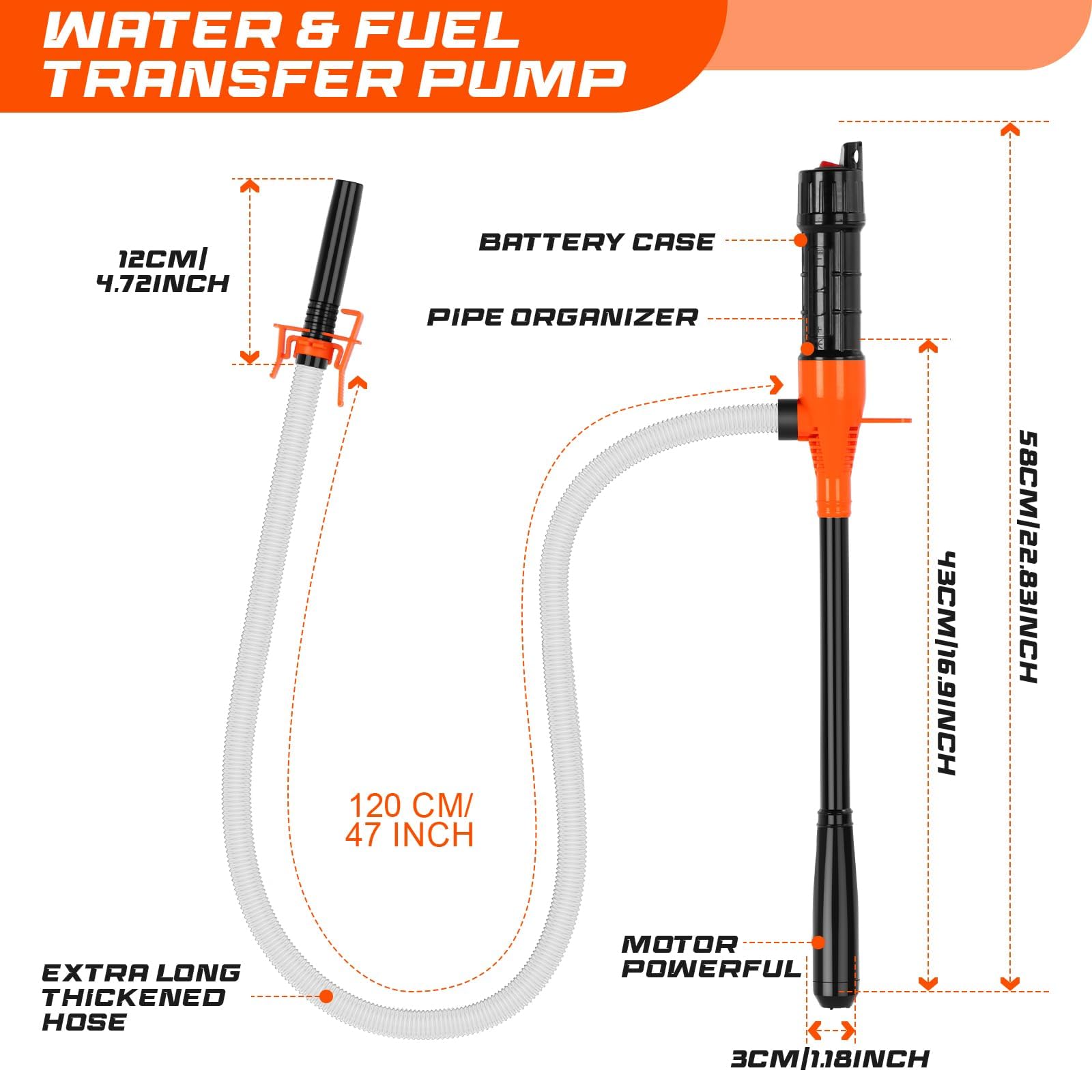 【Powerful Suction Performance & Efficiently Transfer】: Fluid transfer pump with a 1/2 inch discharge tube, 24 inches long, Impeller is used to increase suction power, making transferring liquids a breeze. Is capable of pumping 2.6 gpm and over 1000 gallons on a single set of batteries.