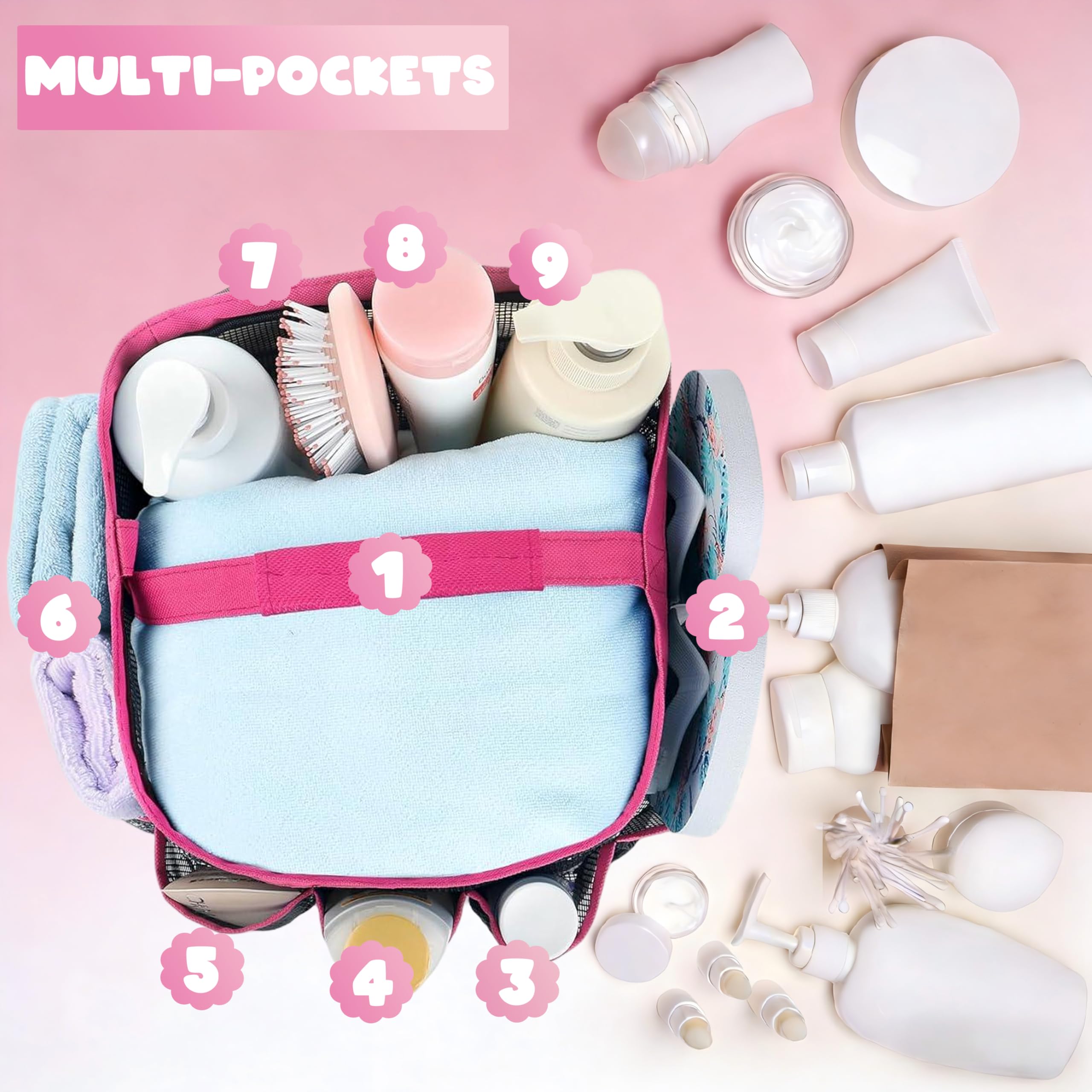 Ample Storage Space : Shower bag has eight outer pockects and a large center one, the main pockets can keep bigger stuffs easily accessible like shampoo,towel, toiletries, hair dryer. Side pockets can contain toothbrush, shaver and keeps them organized