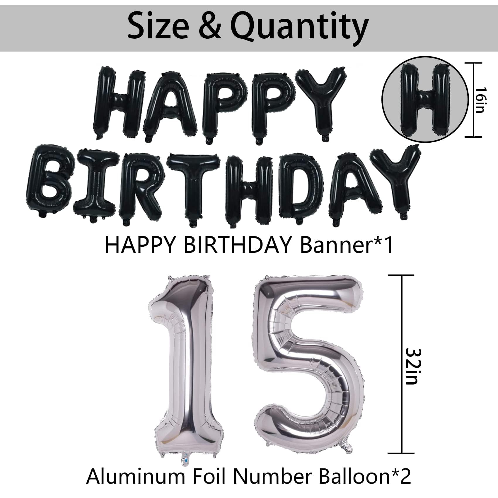 ►WHAT OUR KIT INCLUDES◄: This mysterious 15th happy birthday balloons decor package includes ‘HAPPY BIRTHDAY’ banner*1 set, number 15 foil balloons*2, star foil balloons*2, black latex balloons *12, silver latex balloons *10, silver confetti balloons*4, which will meet all your needs