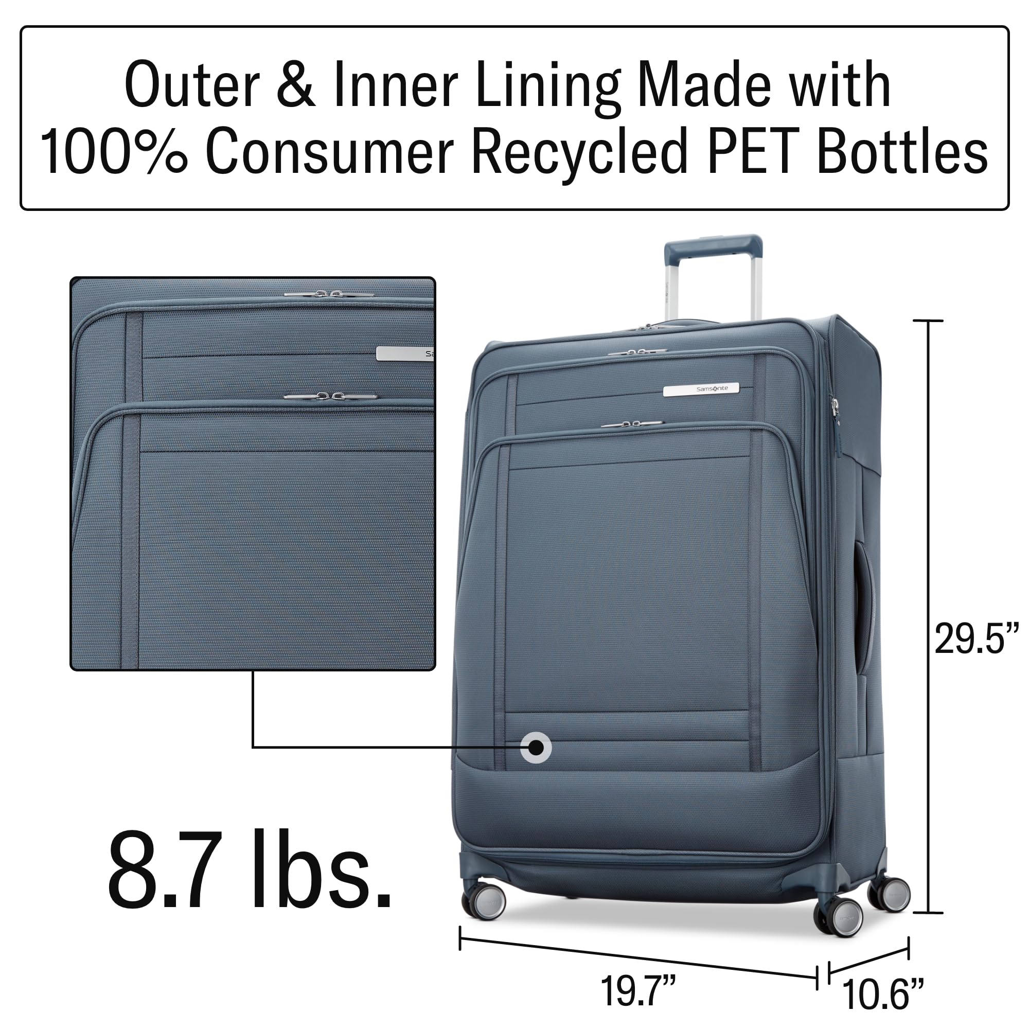 Versatile & Lightweight Luggage - Body fabric is created using 100% post-consumer recycled PET bottles with a weight of only 8.7 lbs. Overall Dimensions (with wheels): 33 in. x 21.25 in. x 13.5 in.