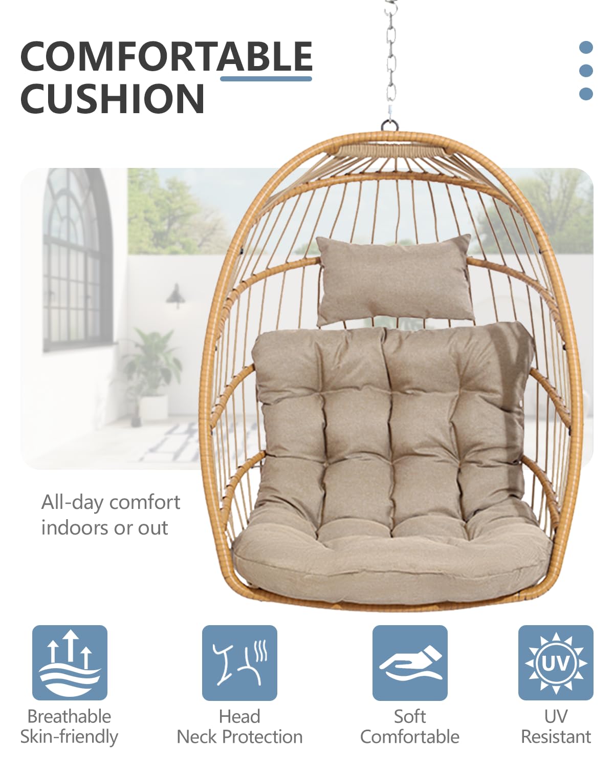 Fits Anywhere, Adds Charm Everywhere: From apartment patios to cozy corners, SWITTE patio egg chair fits seamlessly into any space. Its minimalist look and neutral tones suit gardens, porches, or indoor nooks
