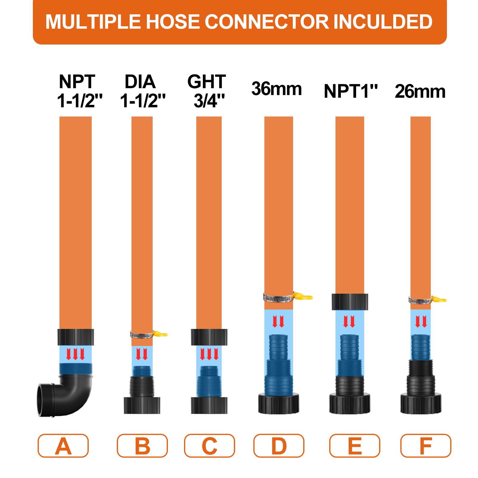Power Motor: Sump Pump with 1HP power motor for Draining water up to 4500 GPH( 75 GPM) at 5ft. Lift water up to 29.5ft of vertical height. Comes with multiple adapters for you to choose to use