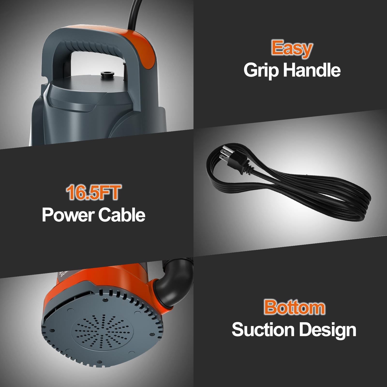 Unique Design: The sump pump features a unique water sensor switch with a non-return valve that efficiently drains water to the lowest suction level of 1/25 inch without any backflow