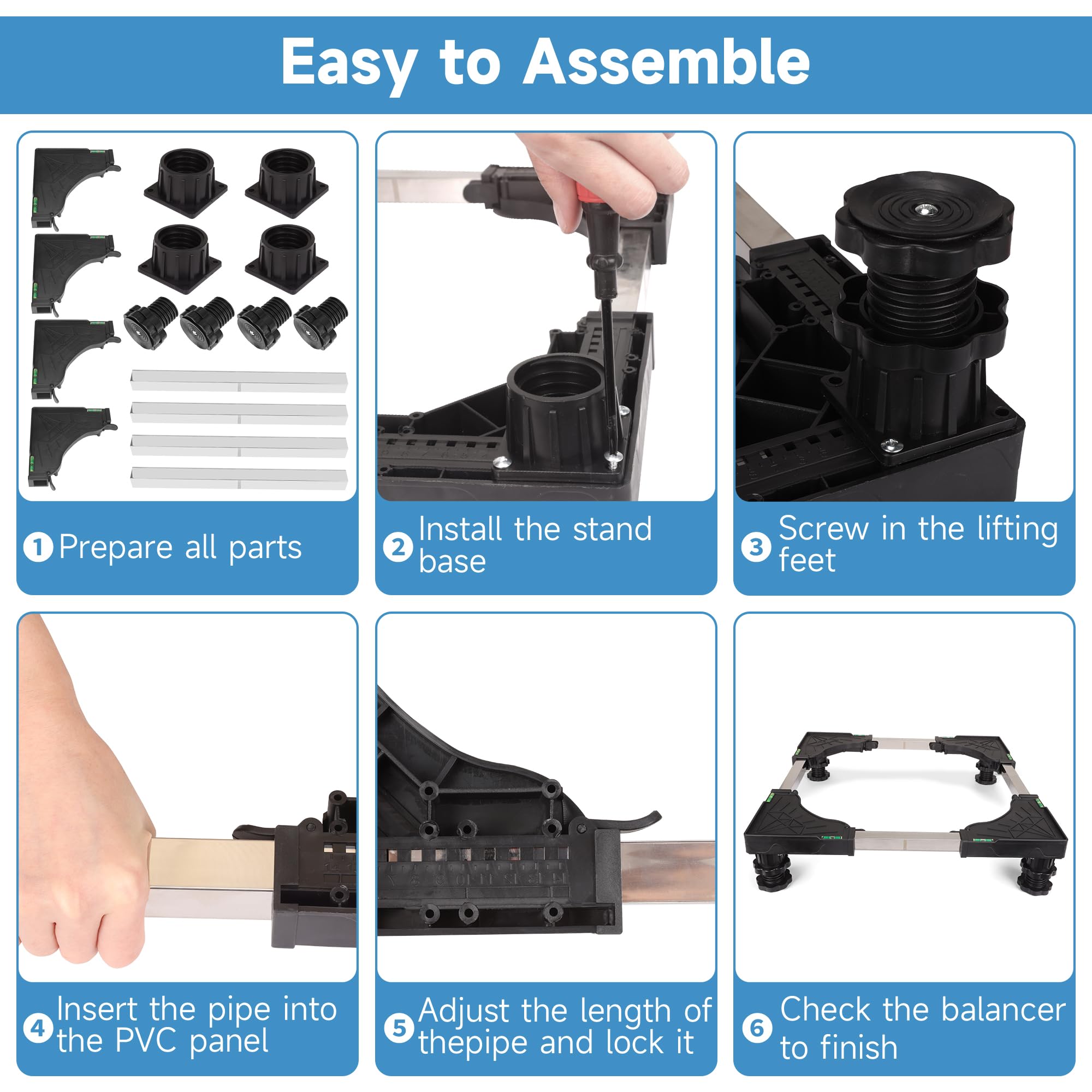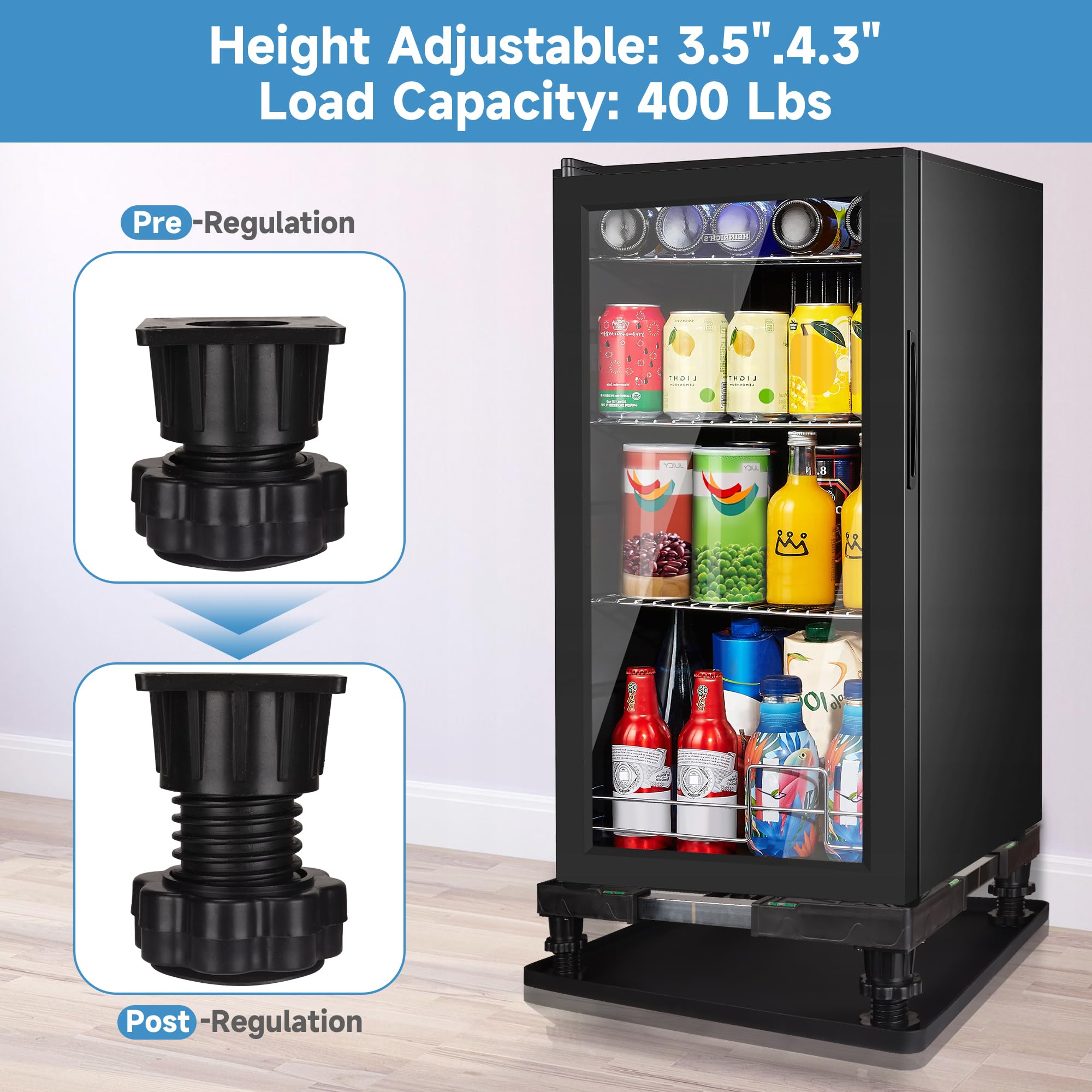 1.【Adjustable Universal Mini Refrigerator Stand Base】The mini fridge base can be adapted to different sizes of appliances, such as mini fridge, single door fridge, washers, dryers, wine coolers, etc.; the width and length of the appliance base can range from 16 inches to 24 inches adjustable between 4 inches and 5 inches in height. The fridge base bracket is made of thickened stainless steel, making the overall structure stronger; a suction cup device is added to the feet to effectively reduce the vibration of the washing machine.