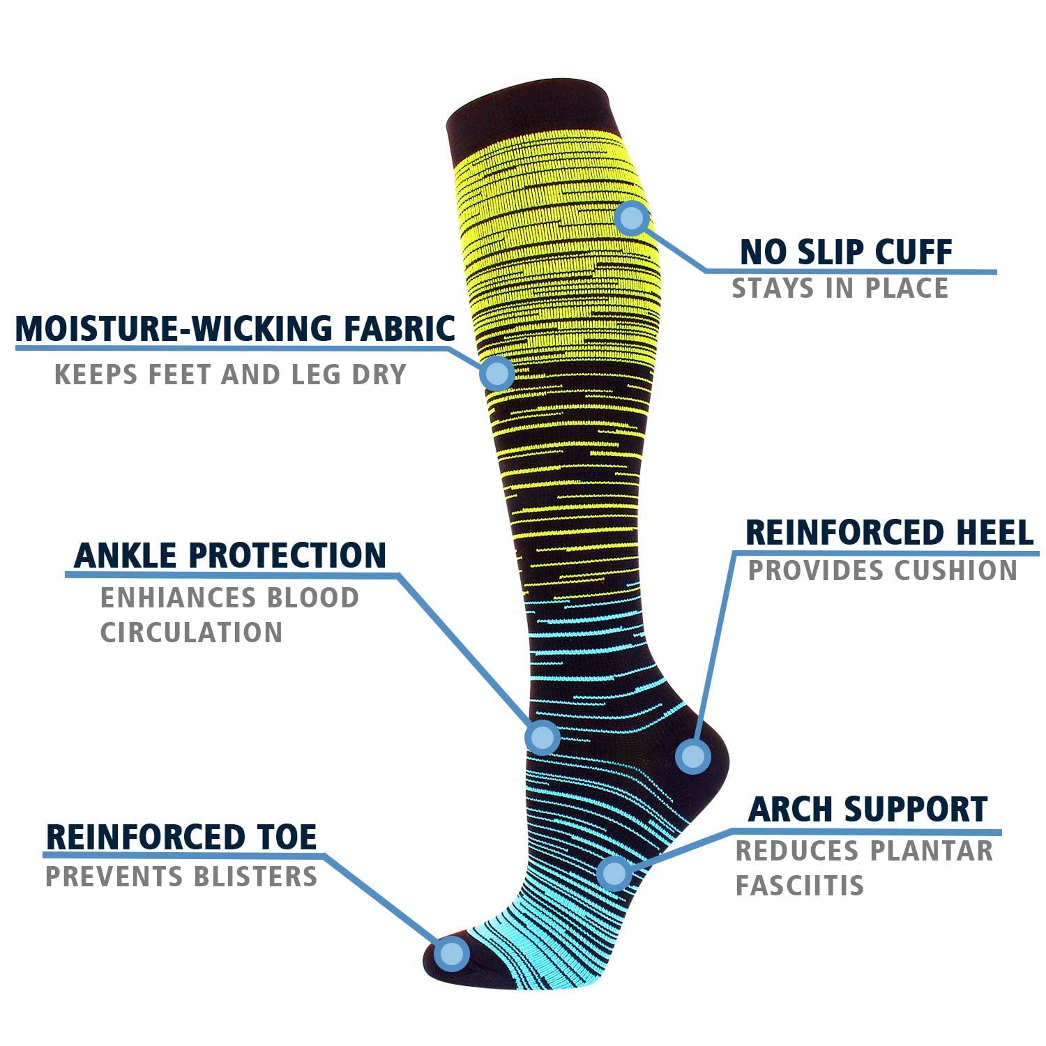 GRADUATED COMPRESSION: Our Graduated Compression Socks put pressure in just the right spots; Provides true graduated compression to support your legs, reduce fatigue, soreness and prevent injuries at the same time