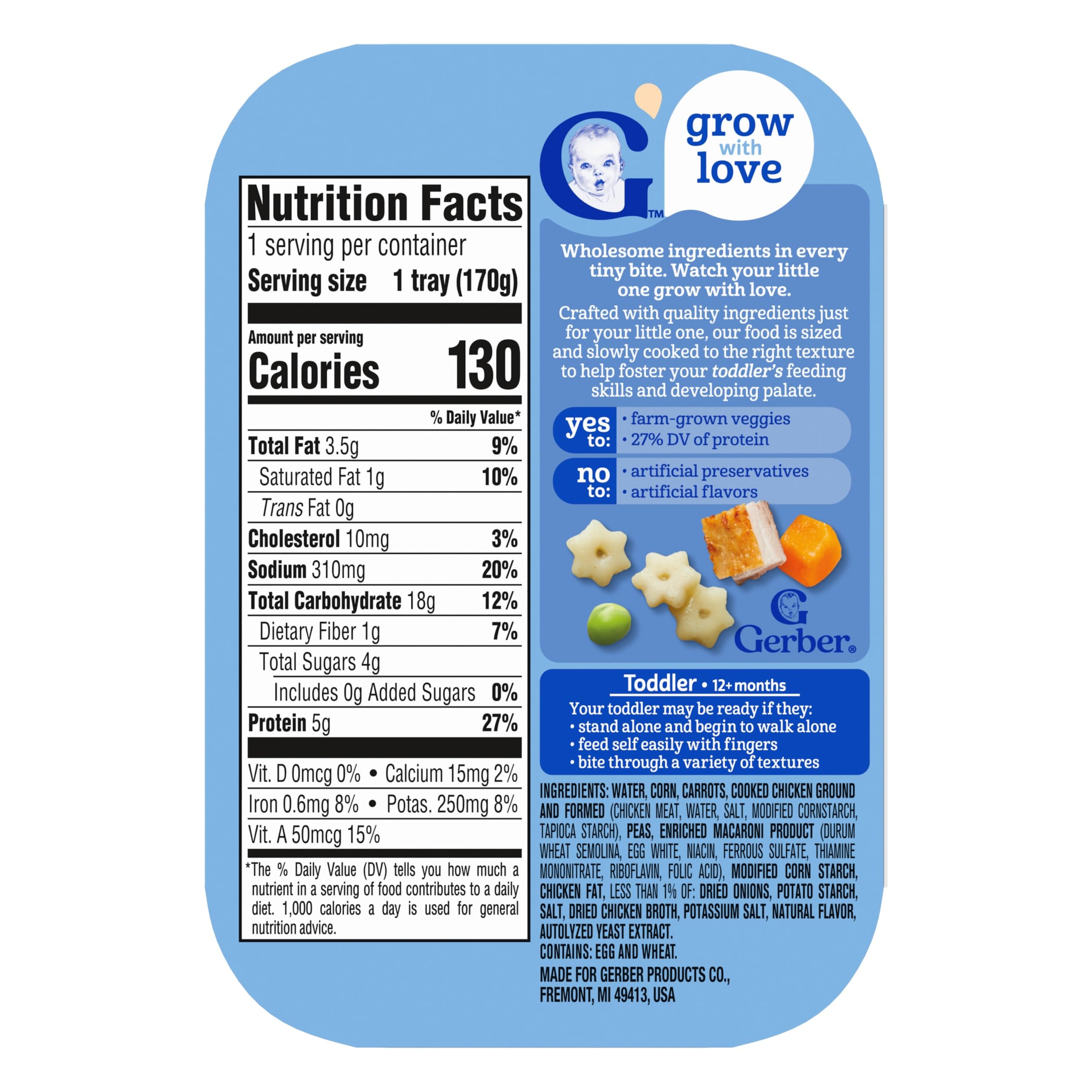 Product Description Gerber Pasta Stars with Chicken and Vegetables is perfect for baby led feeding. With wholesome ingredients designed for tiny hands, this toddler pasta makes mealtime for toddler easier. To prepare, puncture seal on both compartments and microwave for 30 seconds. Then drain liquid and test temperature before serving. Gerber’s dedication to quality has been and always will be our highest priority. We're committed to being your partner in parenthood with quality ingredients & expert guidance. Brand Story By Gerber