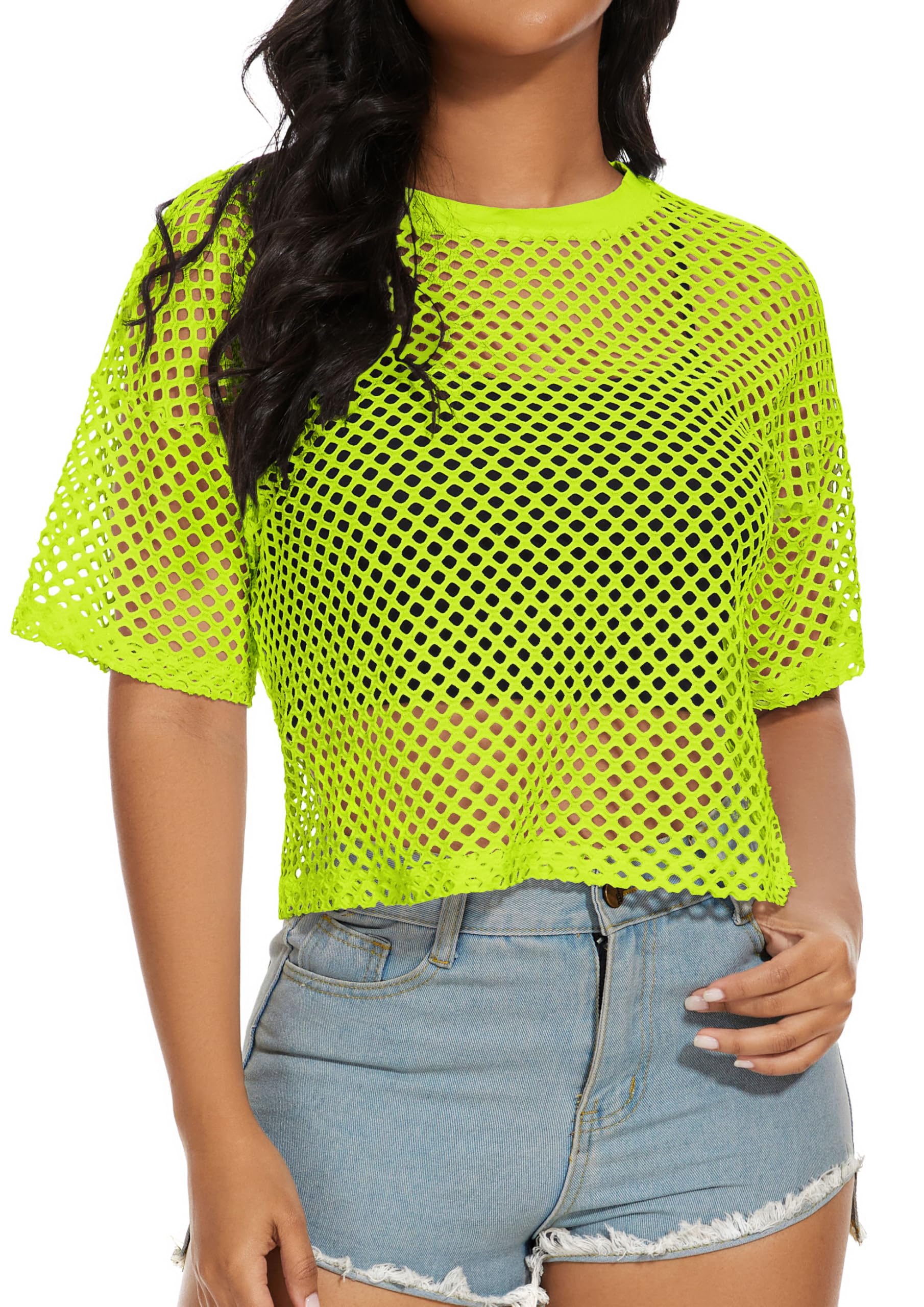 Feature: Sheer mesh top, see through, short sleeves, crew neck, casual style, regular fit, transparent fishnet woman tops add glamour and allure to your outfit.