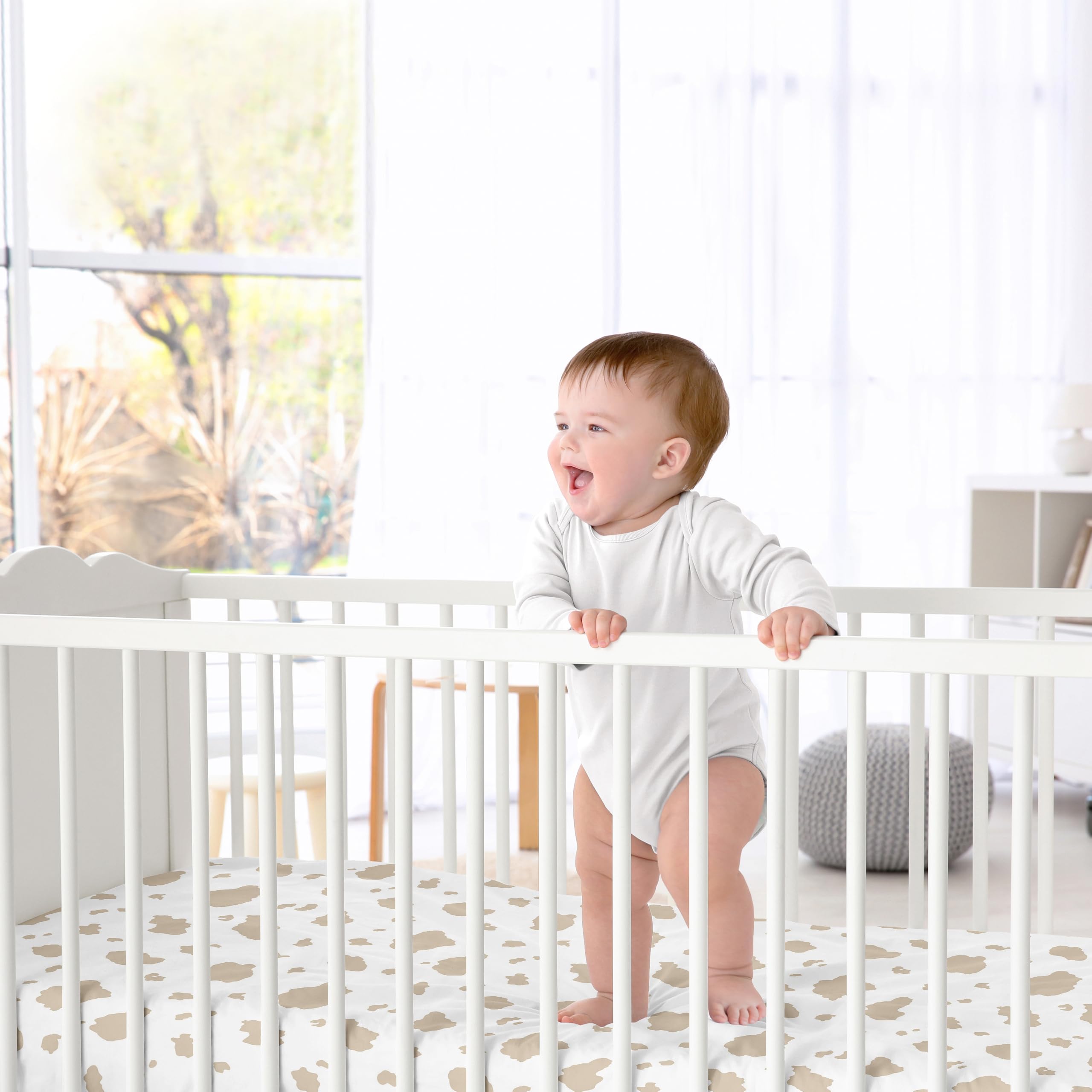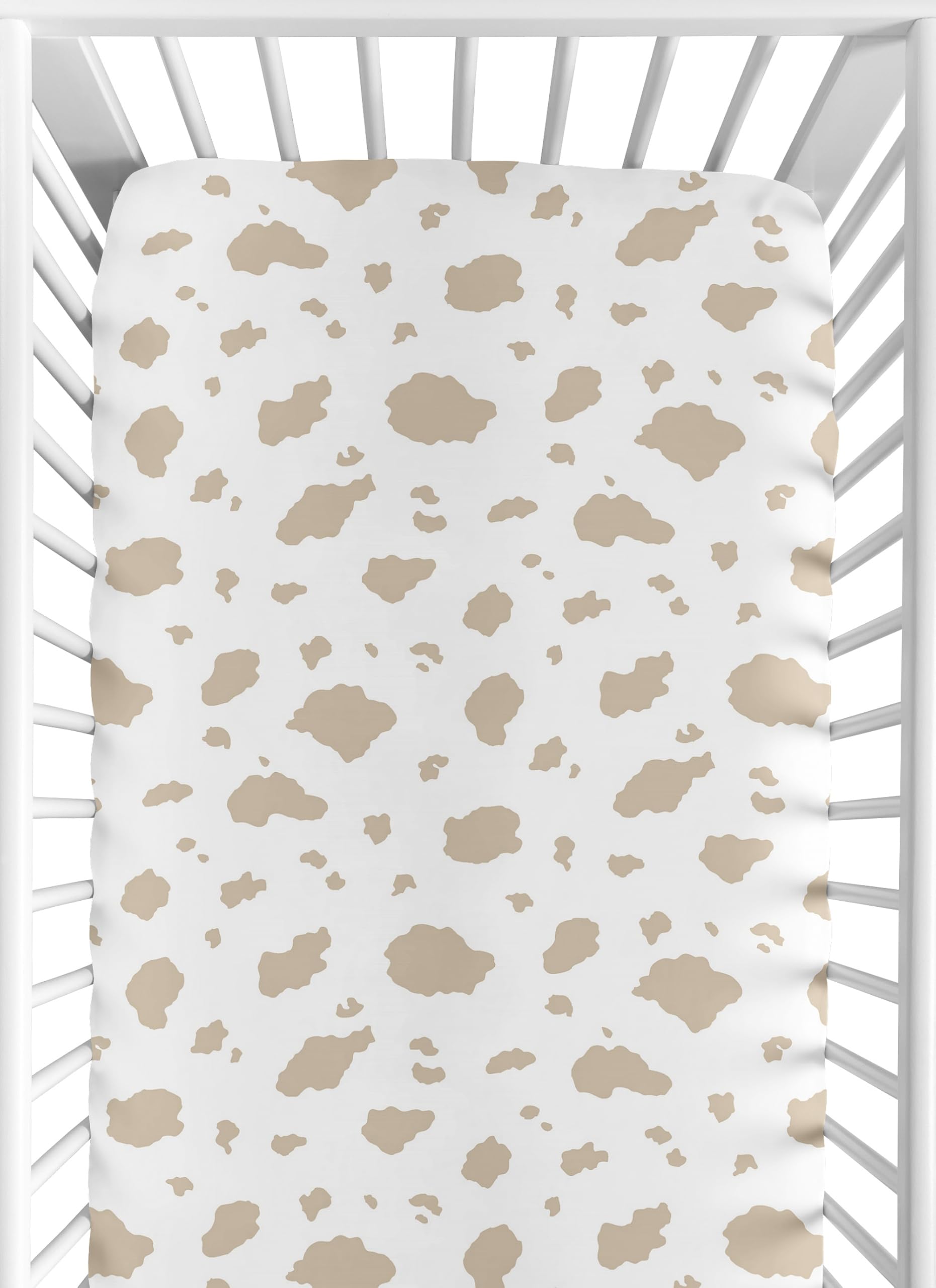 SNUG FIT: Includes: (2) Baby Crib Sheets: 52in. x 28in. x 8in. Our newborn standard crib sheets fit snugly, with premium elastic sewn around the entire bottom edge for a secure fit on most standard sized cribs & toddler beds, to reduce shifting & bunching. This microfiber cribsheets set features an exclusive design of a brown cow print paired with a taupe, brown, blue & red wild west, south, horse, country western cowboy print & is gentle on delicate skin to foster a soothing sleep environment.