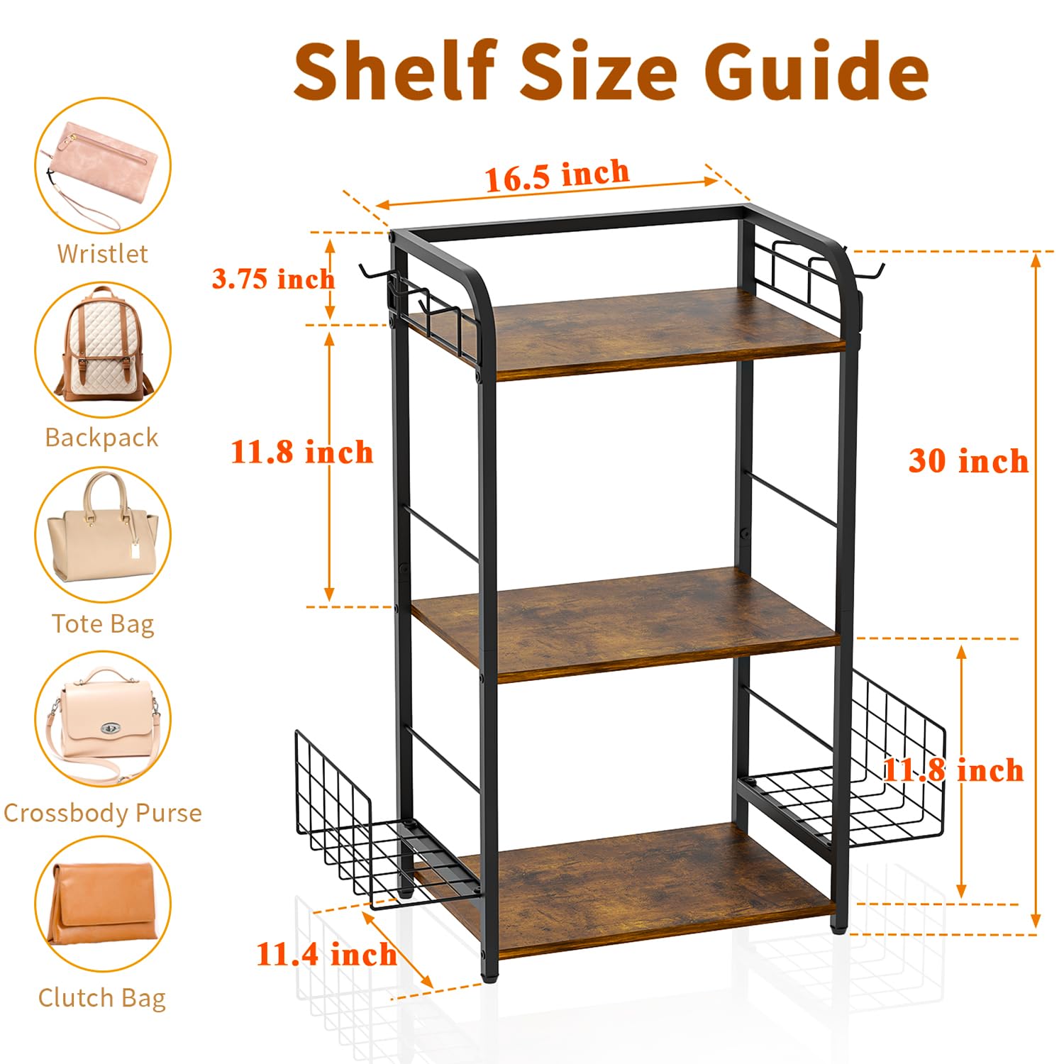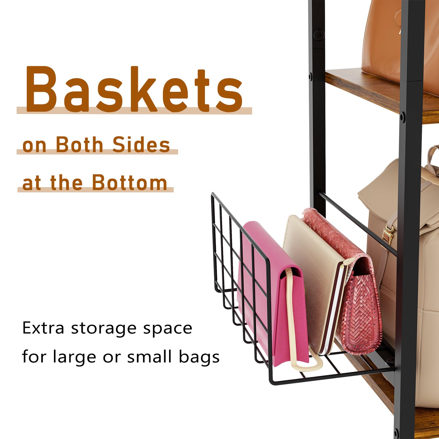 【Effortless Access with Side Baskets】 Enhance your convenience with the integrated side baskets on our handbag storage unit. These smartly designed compartments are perfect for organizing narrow and soft bags, preventing tipping or collapsing. Access your belongings with ease, without the need to rearrange the entire handbag storage organizer. The side baskets keep your bags upright and readily accessible, streamlining your daily routine. Enjoy a clutter-free experience and a more efficient storage solution, eliminating the frustration of digging through stacks of bags.
