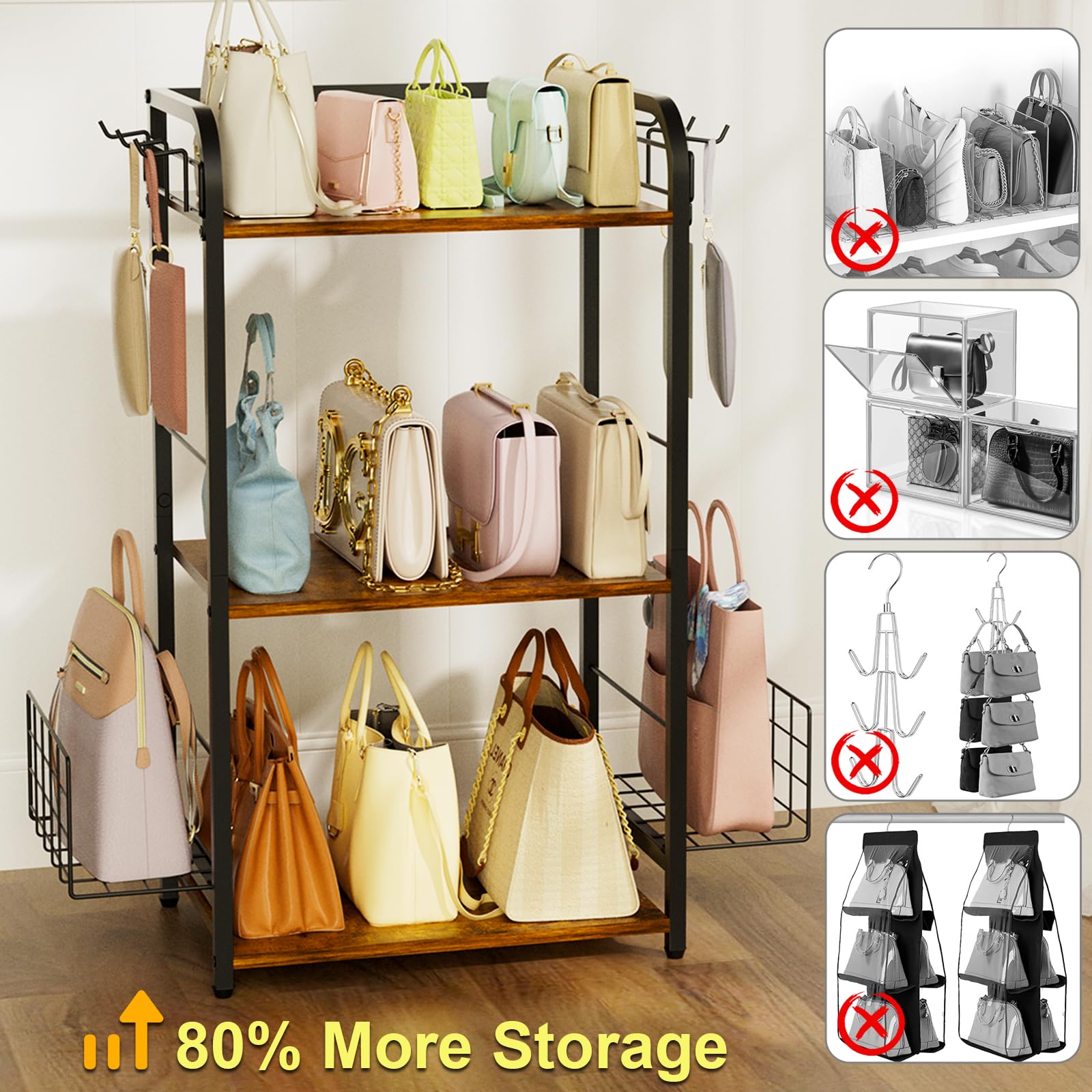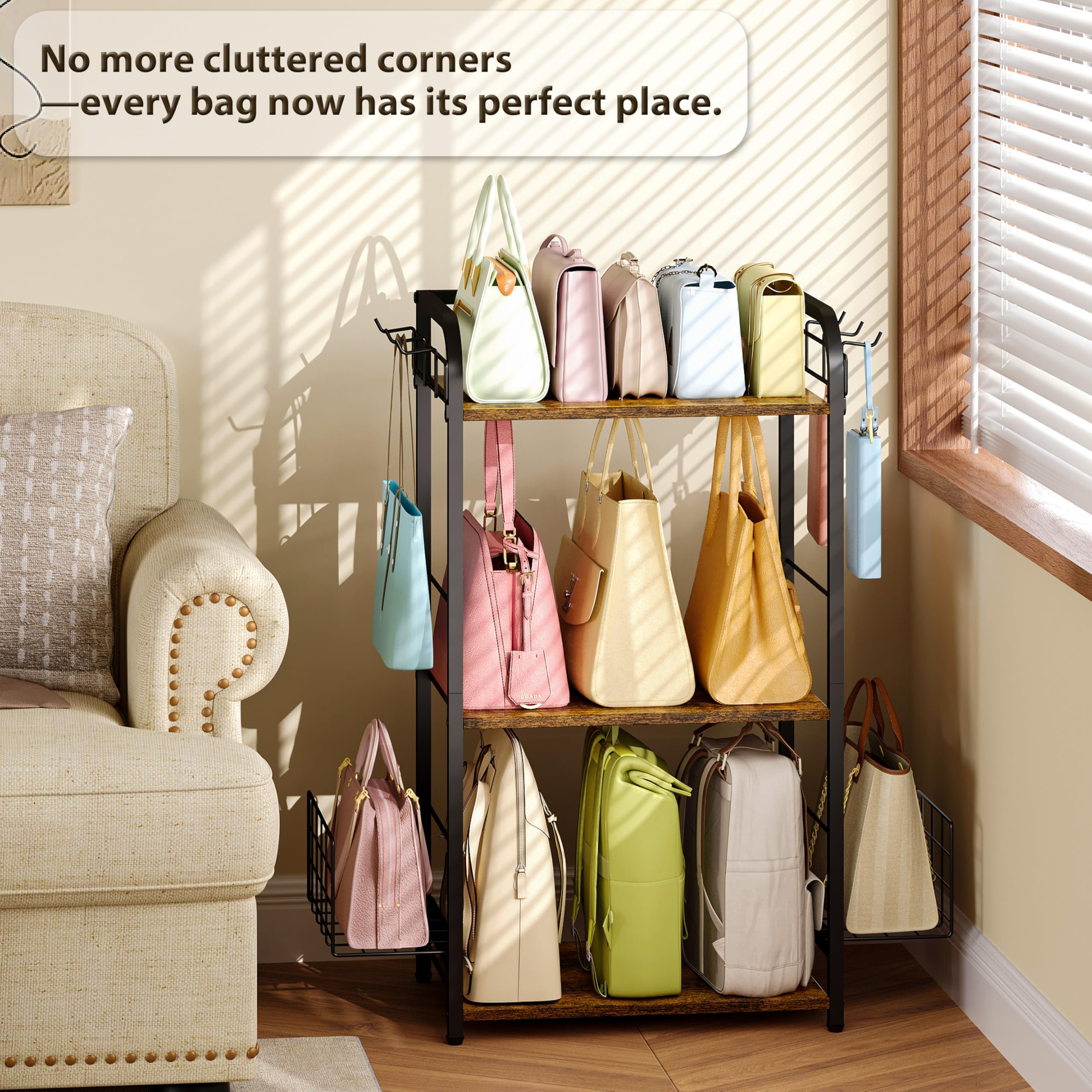 Iron & Wood Floor-Standing 3-Tier Purse Rack with Adjustable Feet, High-Capacity Bag Organizer for Closet, Patent Pending