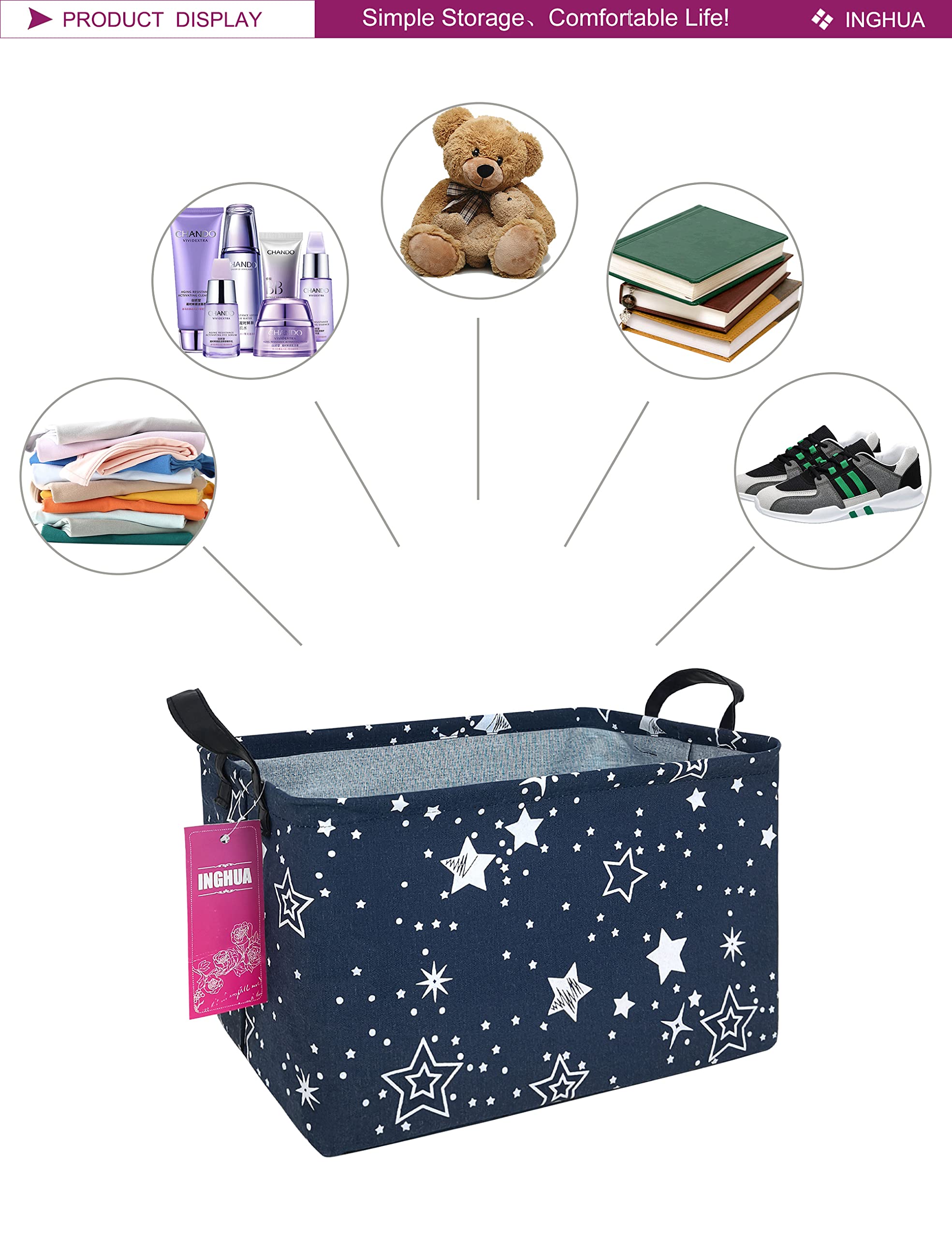Multiple uses: you can use it to collect toys, dolls and story books for your kids,you can use it as a hamper to put your clothes, socks and shoes in, you can even use it as a shopping bag.