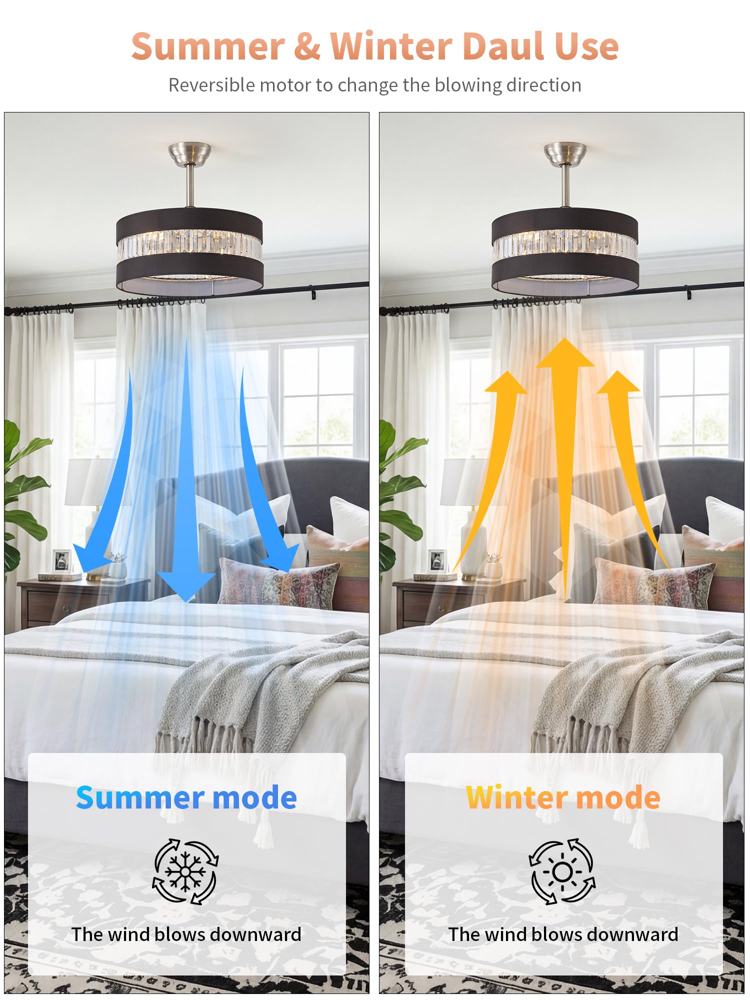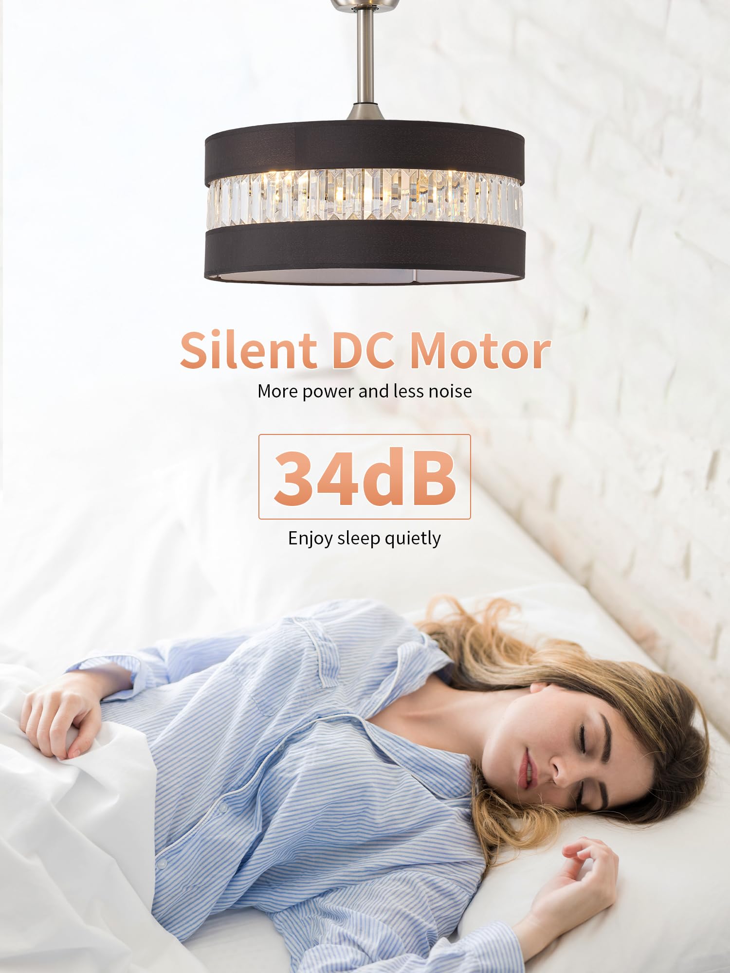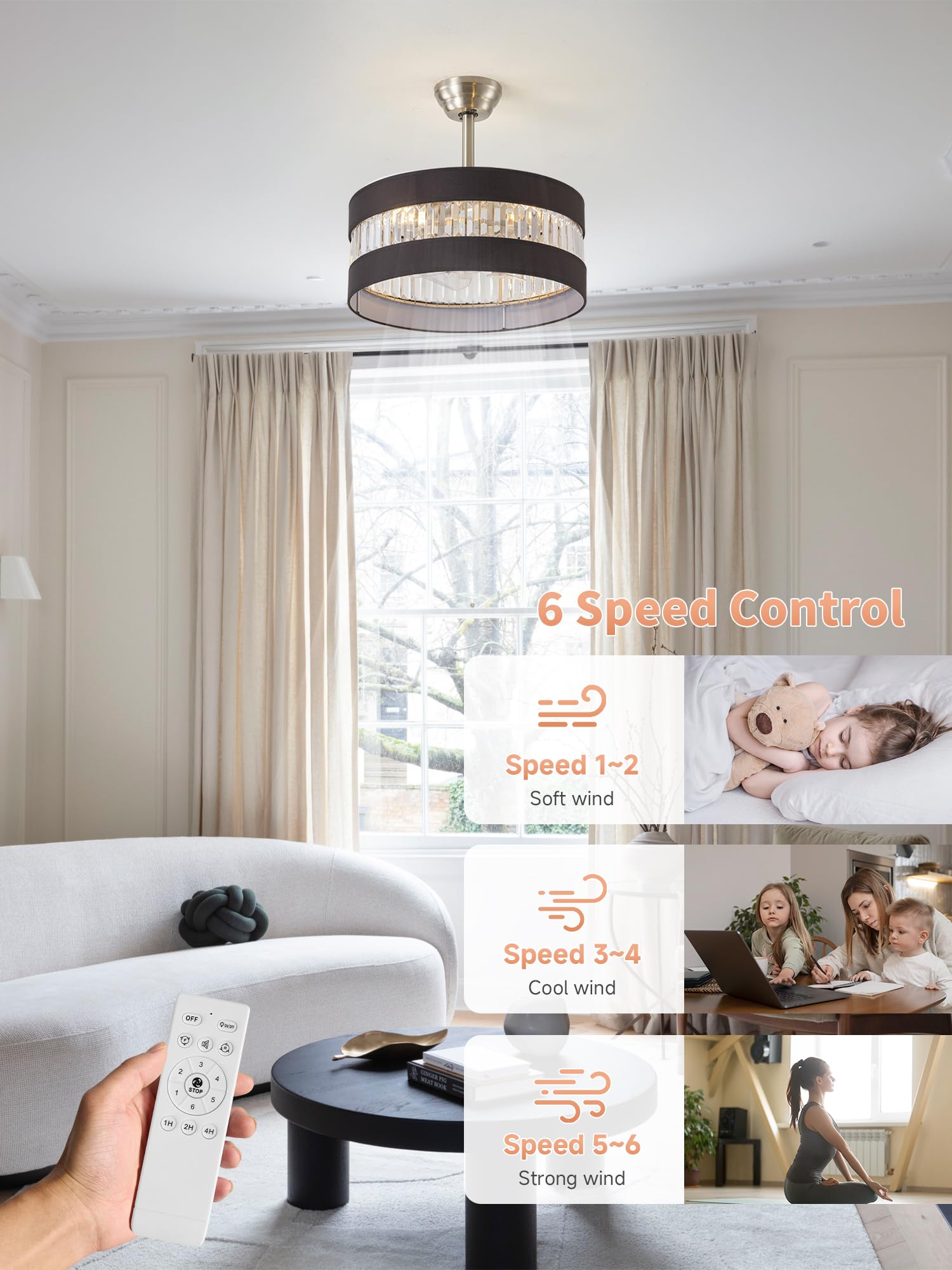 Quiet Night: End the torture of noise and enjoy a peaceful dream! Our black and silver crystal ceiling fans with lights is as quiet as the stars in the night sky when it is in operation, allowing you to easily fall into a sweet sleep. You can set the black and silver ceiling fan with light to automatically turn off after 1, 2 or 4 hours, and its convenient timer function ensures that the black and silver crystal ceiling fan with light will automatically turn off at the right time while you are sleeping, giving you complete peace of mind.