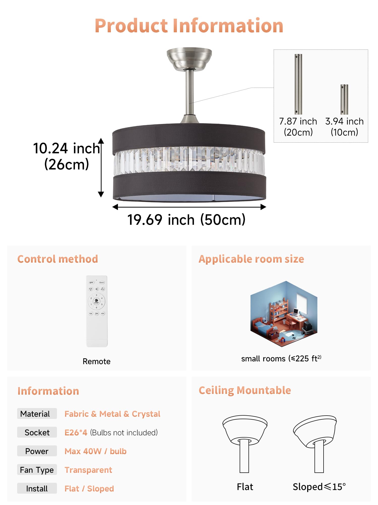 Easy and worry-free installation: We know that complicated installation is not what you want. Our black and silver crystal ceiling fan with light is pre-assembled. This crystal ceiling fans with lights comes with two adjustable height poles (7.87 inches + 3.94 inches) suitable for installation on any type of ceiling, making it easy to decorate your home. Choose your favorite place and easily add style and elegance to create your own garden-like home atmosphere.