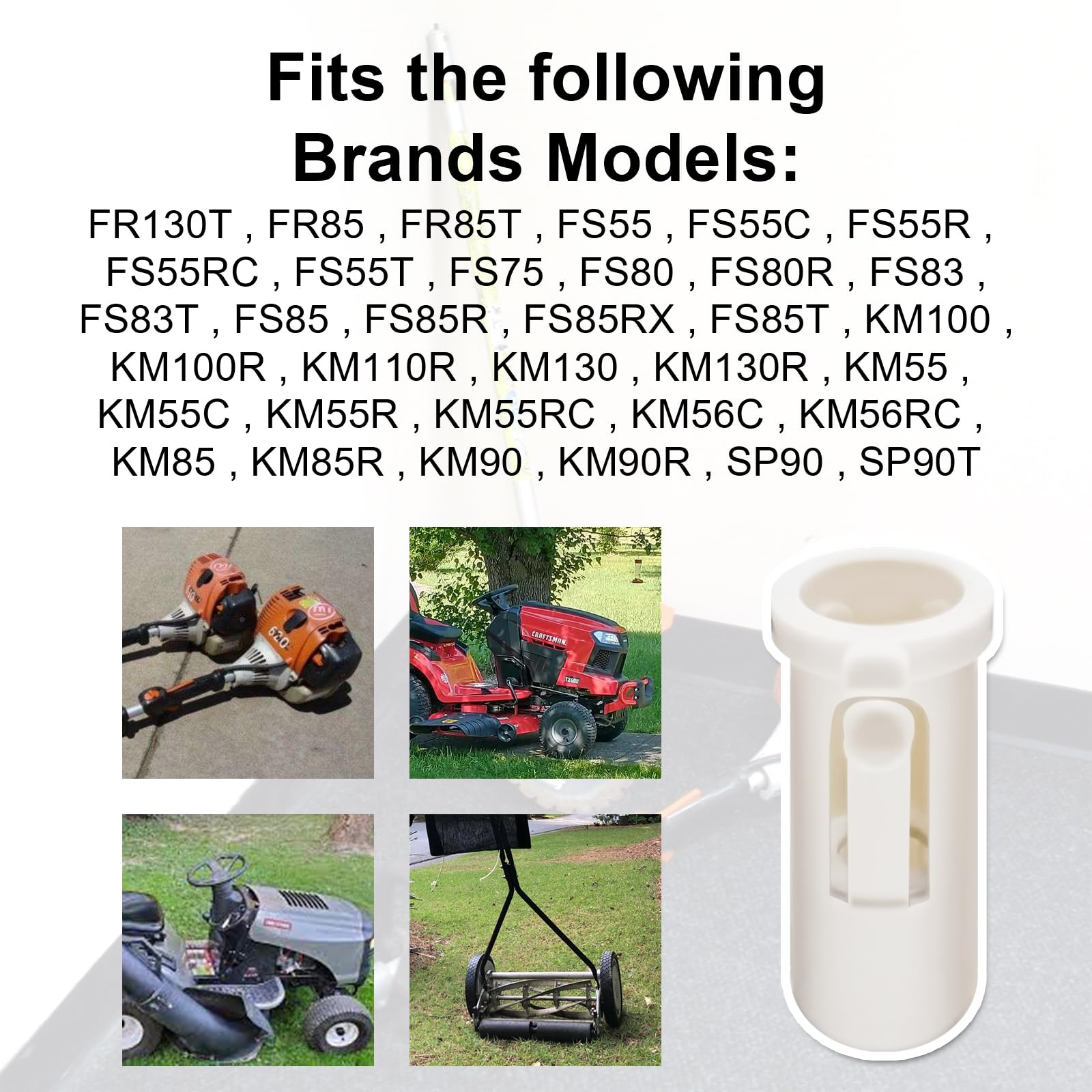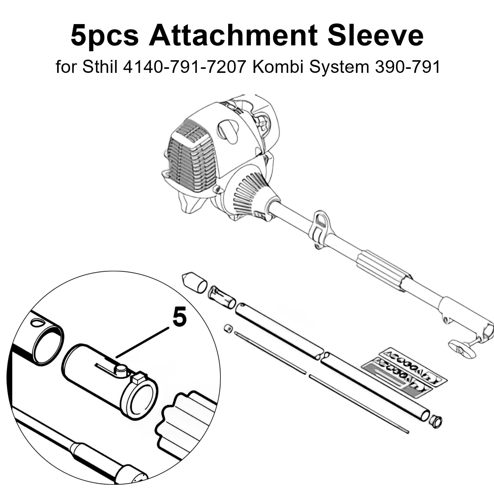Description: Attachment Sleeve, ID: 3/4", OD: 7/8", Length: 2 3/16", 1" flange OD Replaces for Sthil: 4140 791 7207 Fits the following Brands Models: FR130T , FR85 , FR85T , FS55 , FS55C , FS55R , FS55RC , FS55T , FS75 , FS80 , FS80R , FS83 , FS83T , FS85 , FS85R , FS85RX , FS85T , KM100 , KM100R , KM110R , KM130 , KM130R , KM55 , KM55C , KM55R , KM55RC , KM56C , KM56RC , KM85 , KM85R , KM90 , KM90R , SP90 , SP90T includes 5* Attachment Sleeves