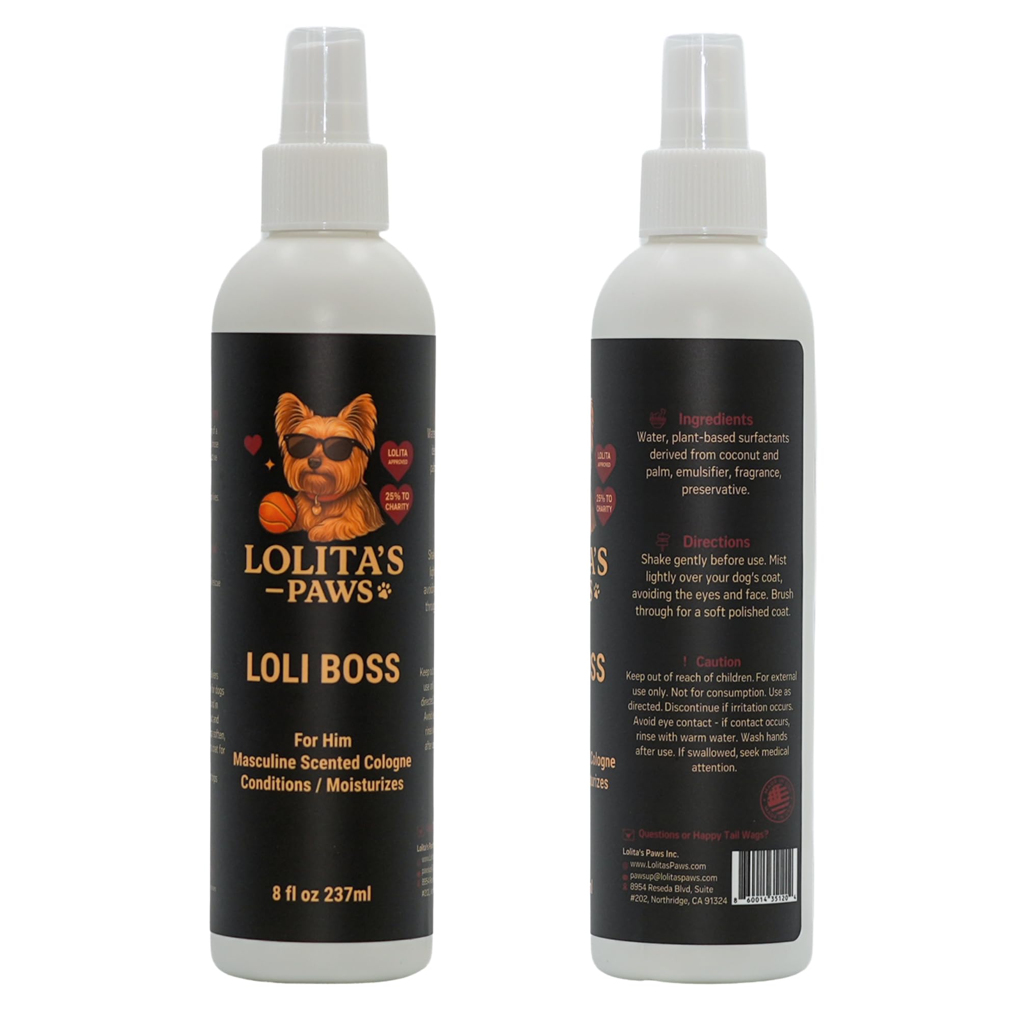 Loli Boss was made for the good boys who strut, charm, and turn heads without even trying. This naturally-derived cologne delivers a confident, masculine fragrance designed to refresh, soften, and condition coats between baths. Infused with coconut and palm-based ingredients, it leaves every pup smelling fresh and feeling smooth — because real gentlemen deserve grooming that’s as bold as their personality. Free from alcohol, parabens, sulfates, and harsh chemicals — because care should never come with compromise. Honest, safe, and paw-satively irresistible, every bottle honors Lolita’s story and helps another pet in need — one paw at a time.