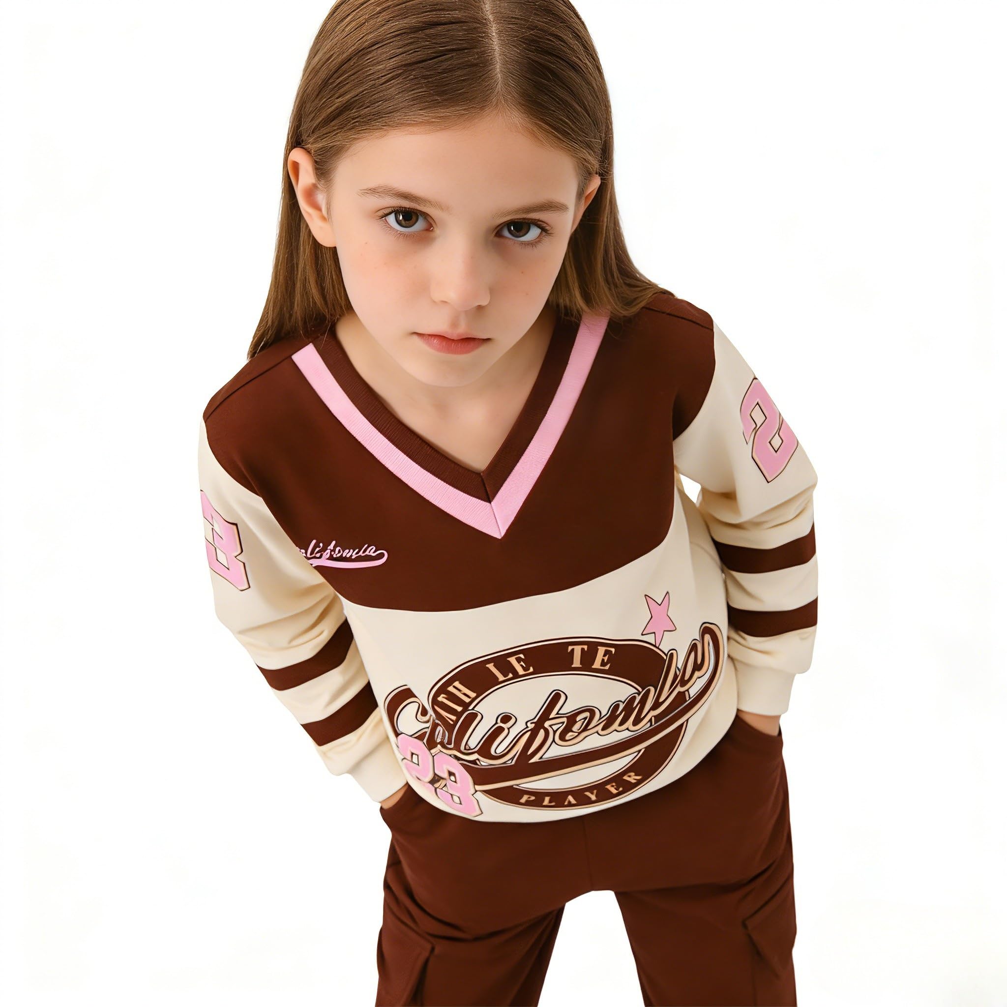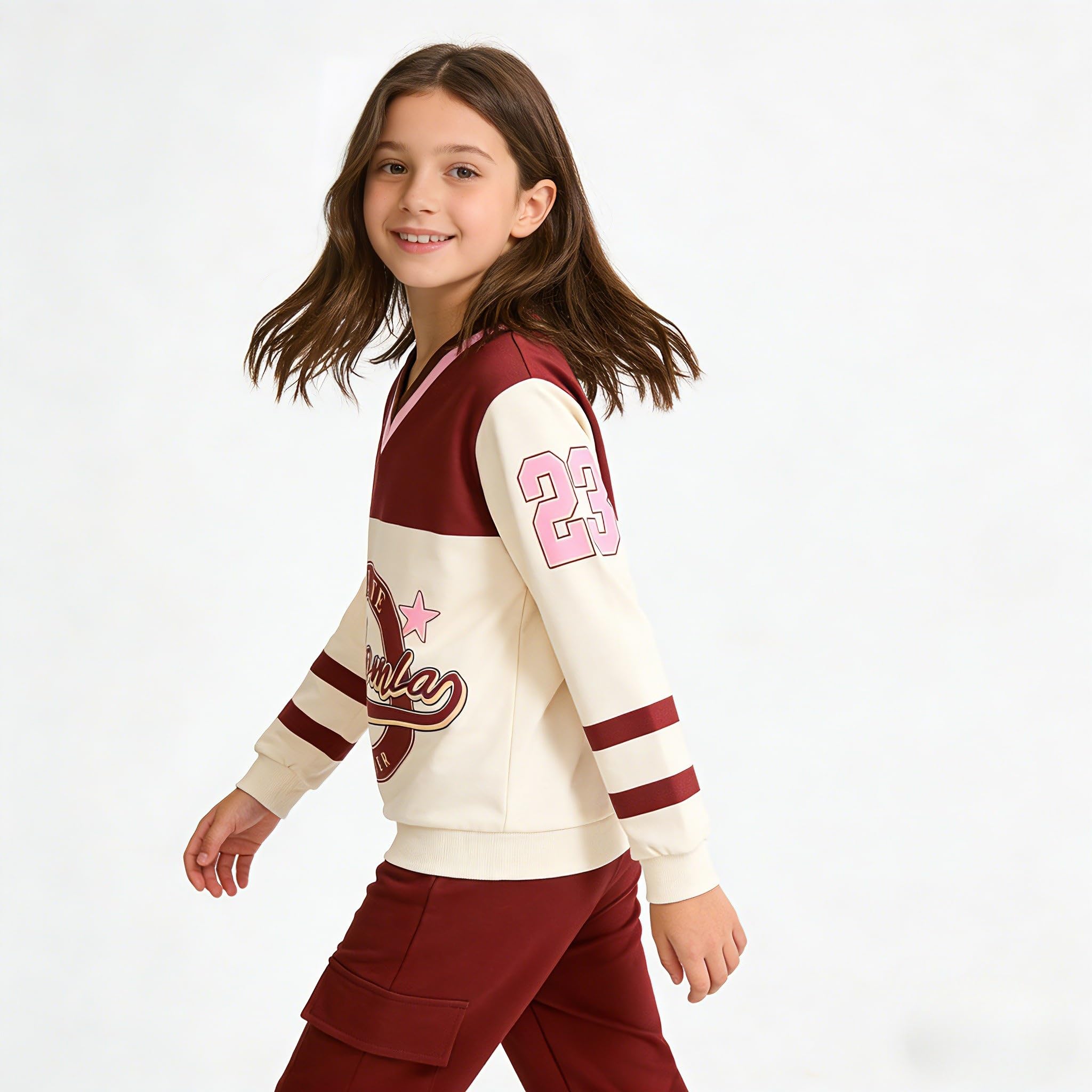 Design: This outfit boasts a sporty color blocking design that's trendy and eye-catching. The sweatshirt comes with a V-neck, adding a touch of chic to the look, and features numeral prints that are fun and stylish. The cargo pants are practical with functional pockets, perfect for holding small essentials like hair ties or candy, combining fashion with daily usability.