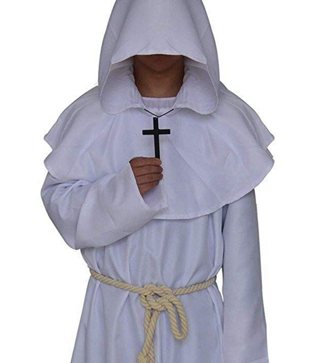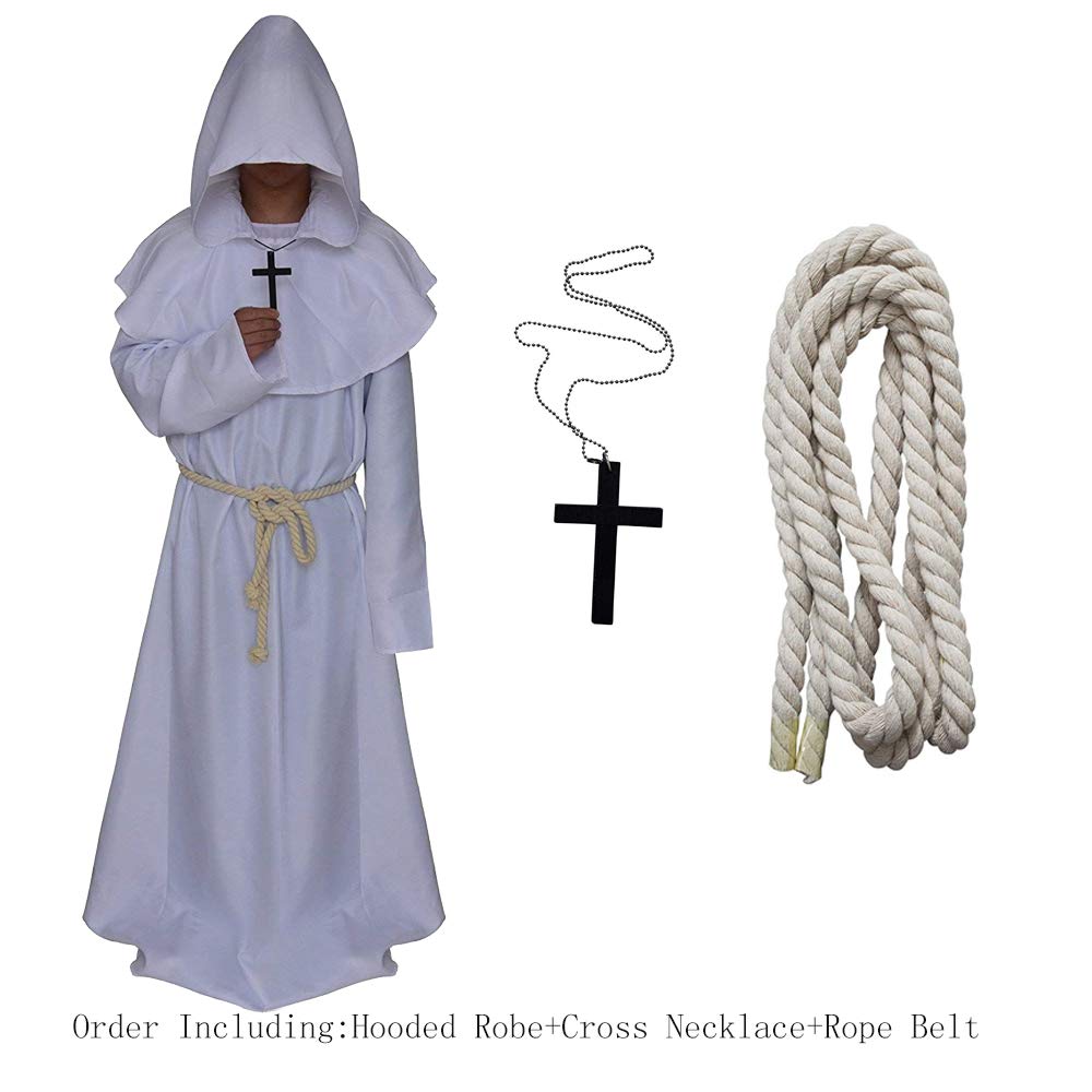 Description Friar Medieval Hooded Monk Renaissance Priest Robe Costume Cosplay Include: Hooded Robe + Rope Belt ( 67" approximately ) + Cross Necklace (Horizontal 2.75", Vertical 3.8") Please be aware this is not US size. Please check the size chart before ordering. ====== Size chart ====== S (Bust 116cm/45.7inch. Shoulder 46cm/18.1inch. Length 140cm/55.1inch. Fit For Height 160-170cm/63-66.9inch) M (Bust 120cm/47.2inch. Shoulder 47cm/18.5inch. Length 145cm/57.1inch. Fit For Height 170-175cm/66.9-68.9inch) L (Bust 124cm/48.8inch. Shoulder 48cm/18.9inch. Length 150cm/59.1inch. Fit For Height 175-179cm/68.9-70.5inch) XL (Bust 128cm/50.4inch. Shoulder 49cm/19.3inch. Length 155cm/61.1inch. Fit For Height 179-183cm/70.5-72.1inch) XXL (Bust 132cm/52.0inch. Shoulder 50cm/19.7inch. Length 160cm/63.0inch. Fit For Height 183-187cm/72.1-73.6inch)