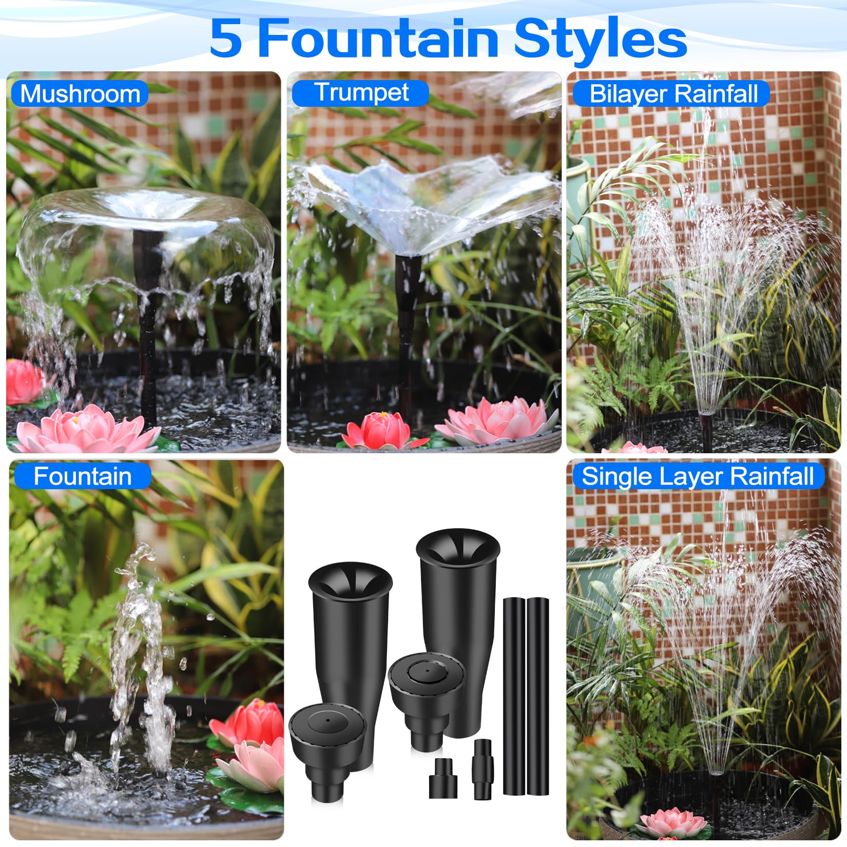 5 Fountain Patterns: Blossom and trumpet fountain head. First level rain, second level rain, and gushing spring,,Select the corresponding nozzle from the variety-pack. Easily replacement