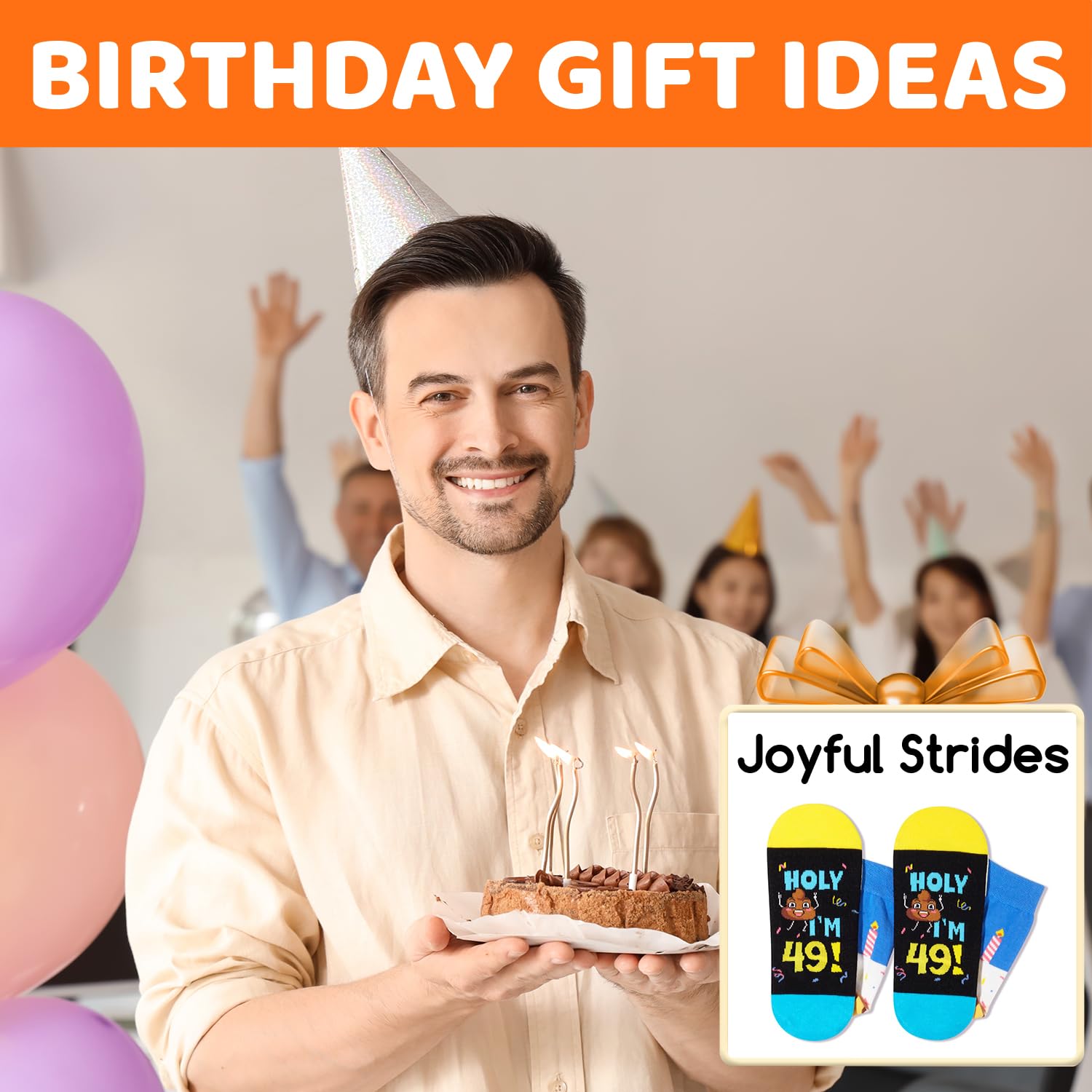 GIFTS FOR 49 YEAR OLDS: The top of the socks features birthday candles, cakes, and other elements, the bottom features a hilarious secret message written in non-slip ink: "HOLY I'M 49!".