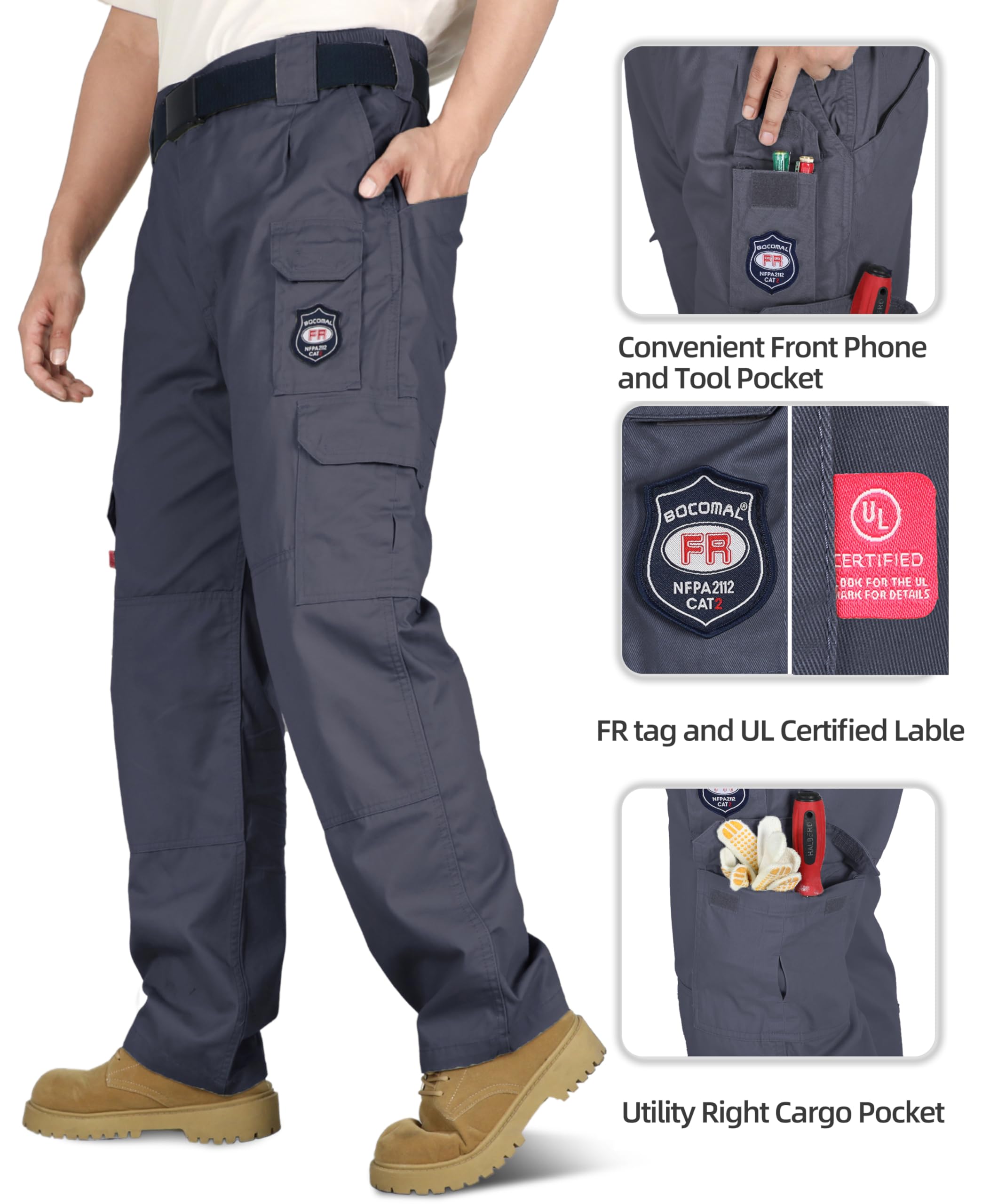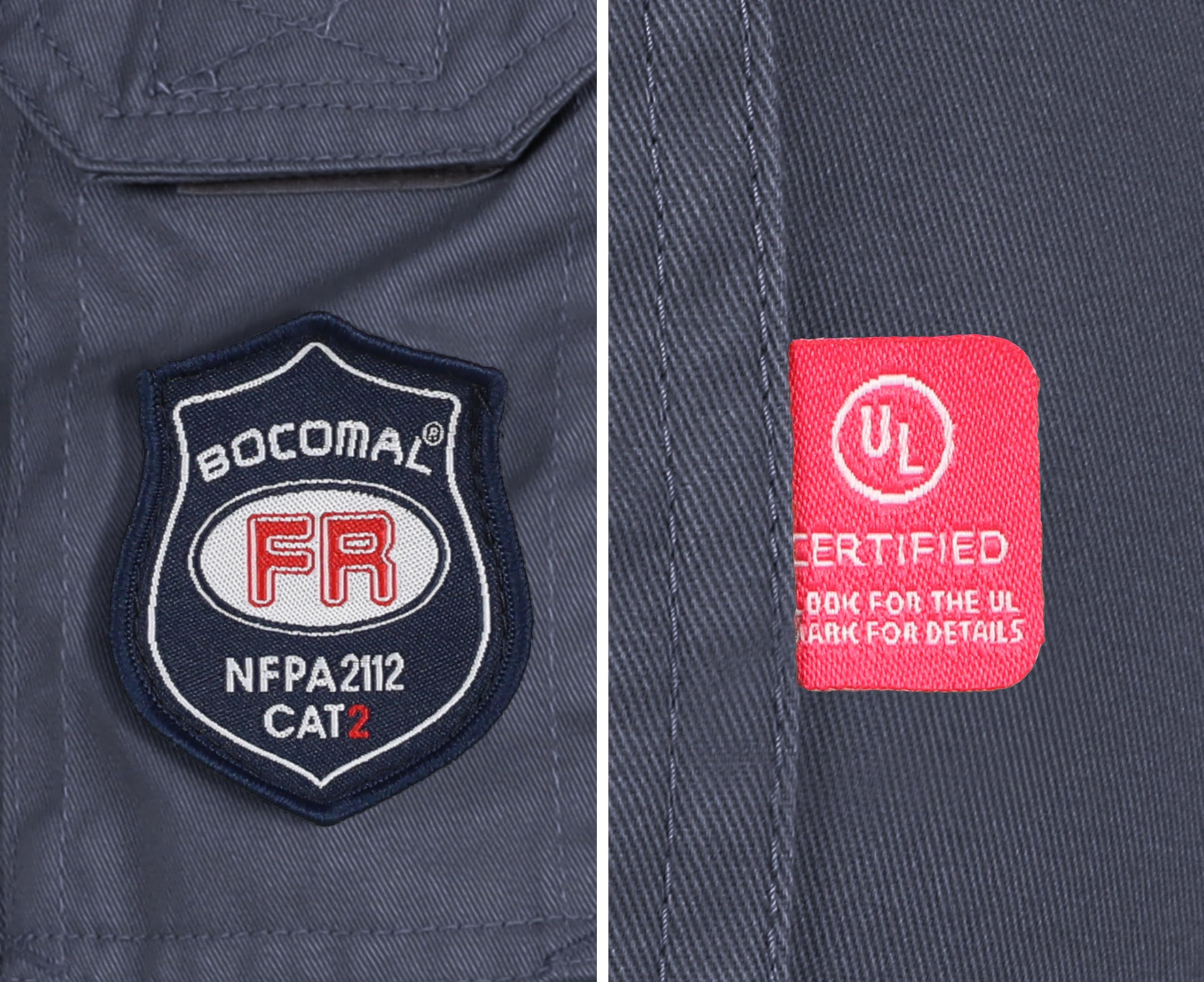 FR MATRIALS:Light Water/Rain Repellent and Oil/Stain Resistant,7.5OZ Cotton Twill FR Treated,FR Buttons,FR Aramid Sewing Threads!Clear FR Tag on Phone Pocket front.More FR info On Neck Tag about UL Certification.We Attached A Small Sample Inside Package for Customers Simple FR Try
