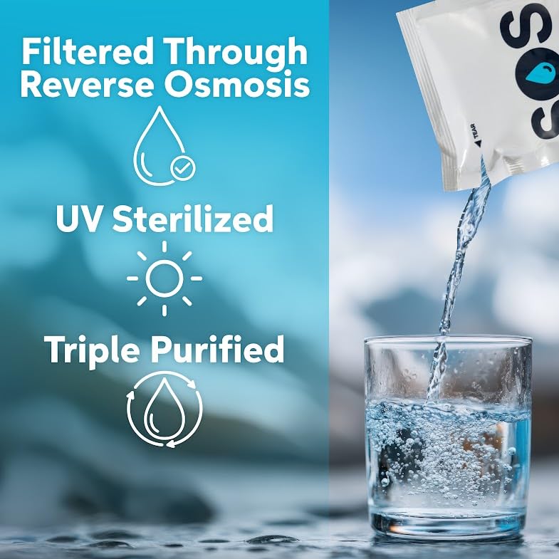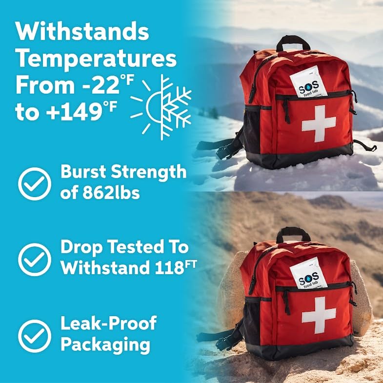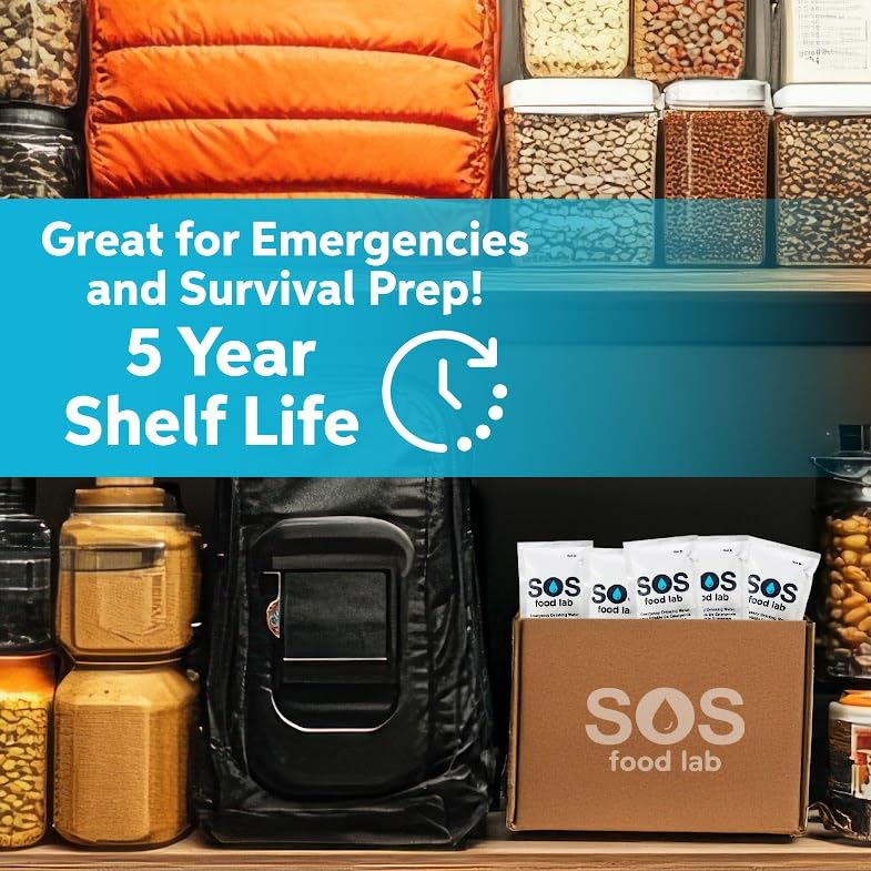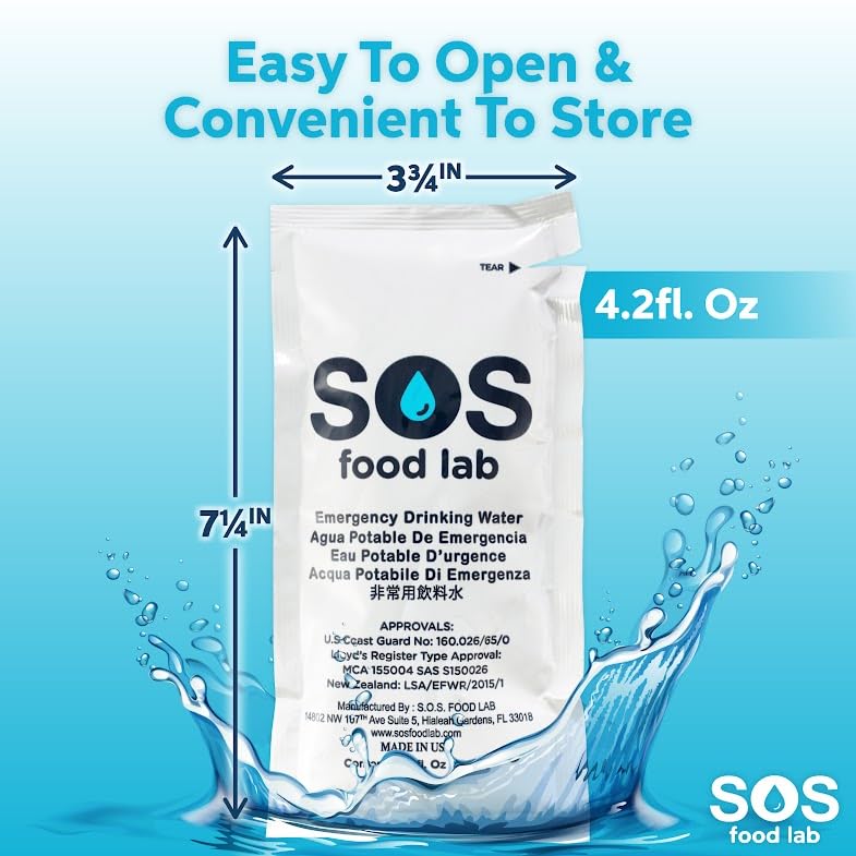 SOS Food Lab Emergency Water Pouches are each 4.2 fl oz with triple-purified water processed through reverse osmosis, UV sterilization, and ozonation for safe, fresh hydration. With approval from the U.S. Coast Guard and U.S. Navy, these water pouches meet the highest safety standards for emergency preparedness. Designed to withstand harsh conditions, they endure temperatures from -22°F to +149°F and feature an industry-leading burst strength of 862 lbs. Drop-tested from heights of up to 118 feet, they remain intact and ready for use. Easy-open, space-saving pouches make them a perfect addition to emergency kits, survival packs, and disaster preparedness supplies. With a 5-year shelf life, these water pouches provide peace of mind for first responders, survivalists, and anyone preparing for the unexpected.
