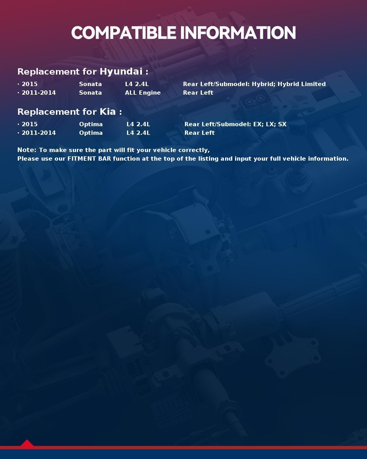 [Vehicle Fitment]: Compatible with Hyundai Sonata 2011-2014 (L4 2.0L|L4 2.4L), Sonata 2015 L4 2.4L (Hybrid| Hybrid Limited); Kia Optima 2011-2014 (L4 2.4L), Optima 2015 ( SX| EX Luxury| EX| LX) ---Rear Left Driver Side. For Kia Optima models only fit for L4 2.4L, and for the 2015 Kia Optima do not fit for Hybrid LX or Hybrid EX models