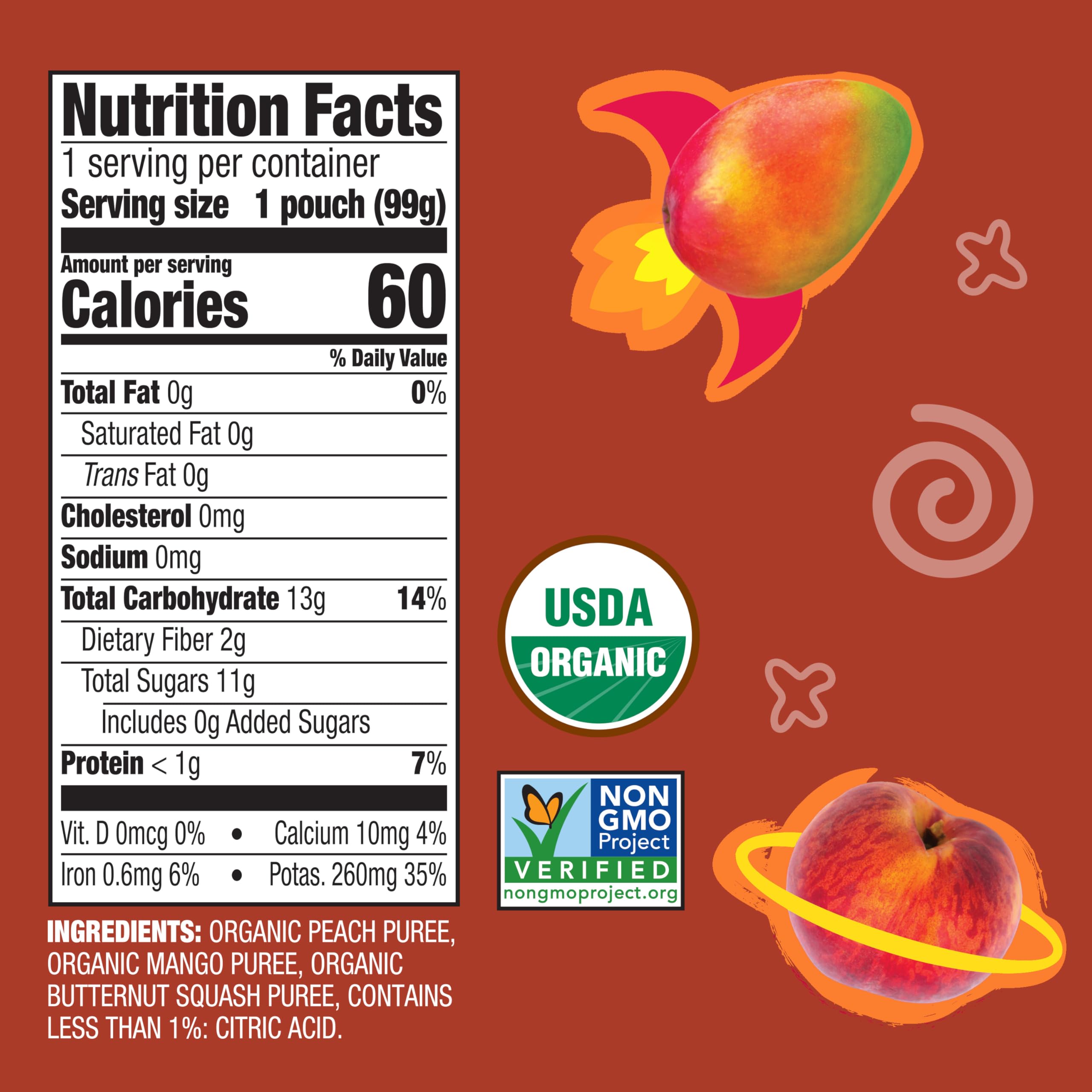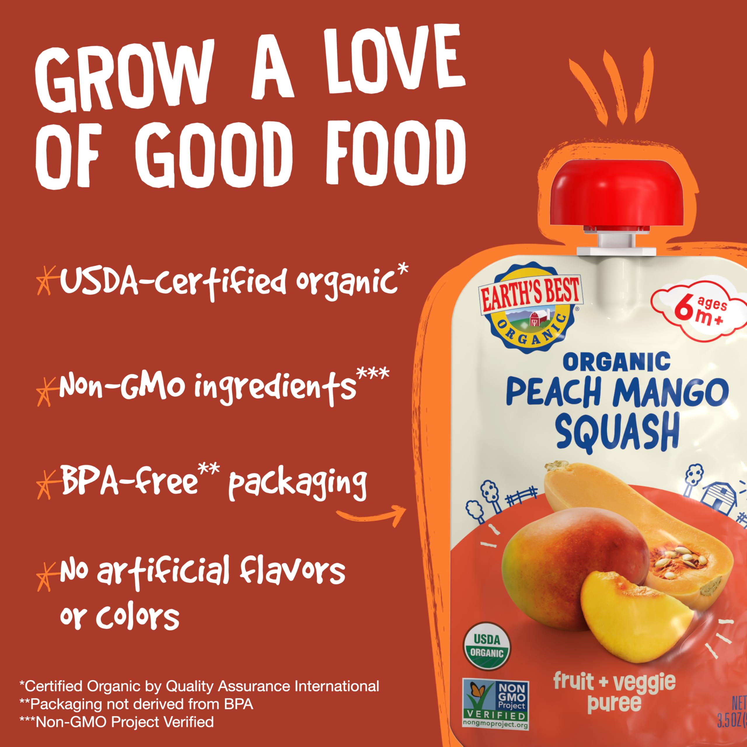 As your little ones grow, their palates grow too β so help them explore a new world of food with Earth's Best Organic pouches. Designed with little taste buds in mind, our purees have the right flavors and textures for each step of your little onesβ developmental journey and help them grow a love of good food.Earth's Best Organic Fruit + Veggie Puree Pouch Peach, Mango + Squash is made with real organic fruits and veggies. For little ones 6+ months.