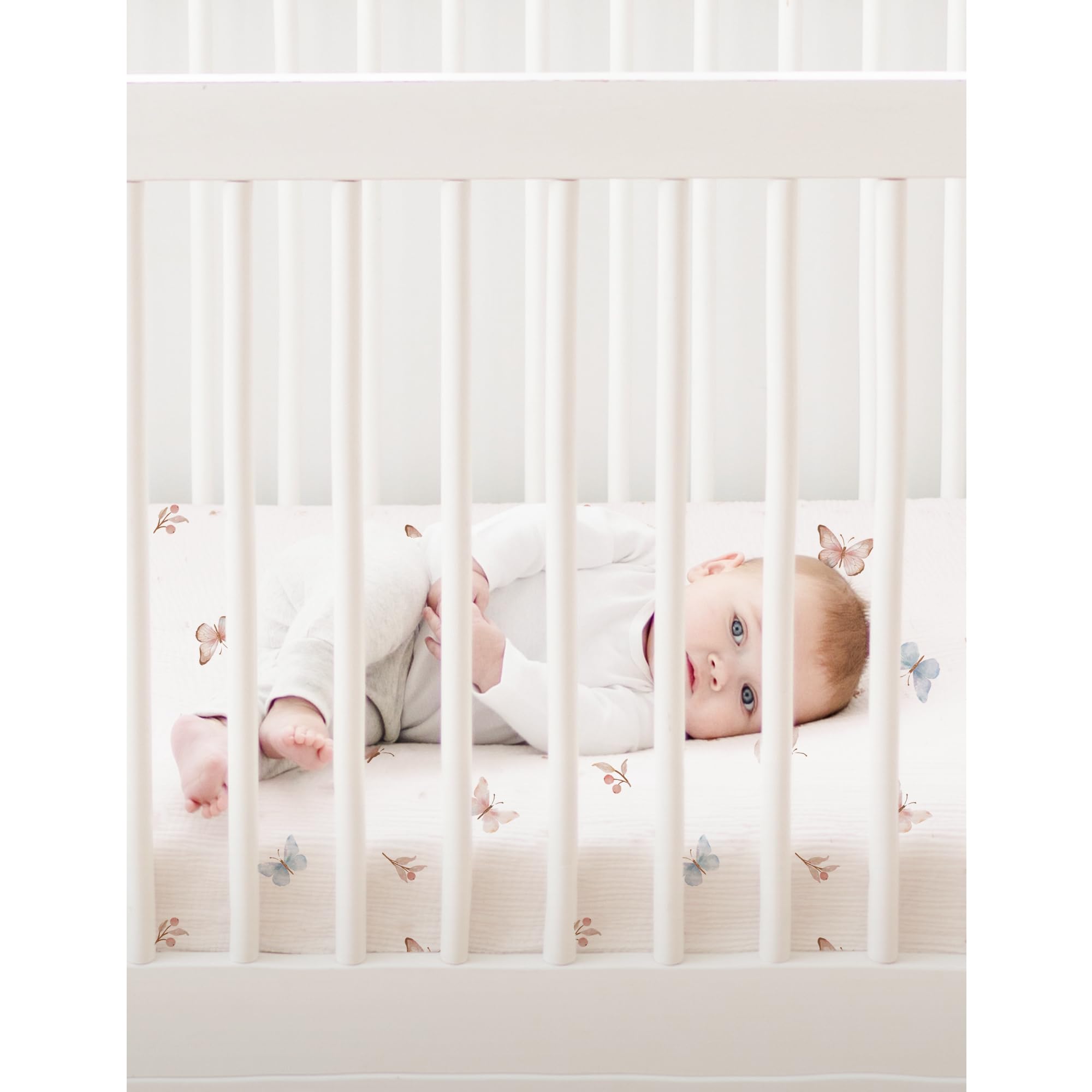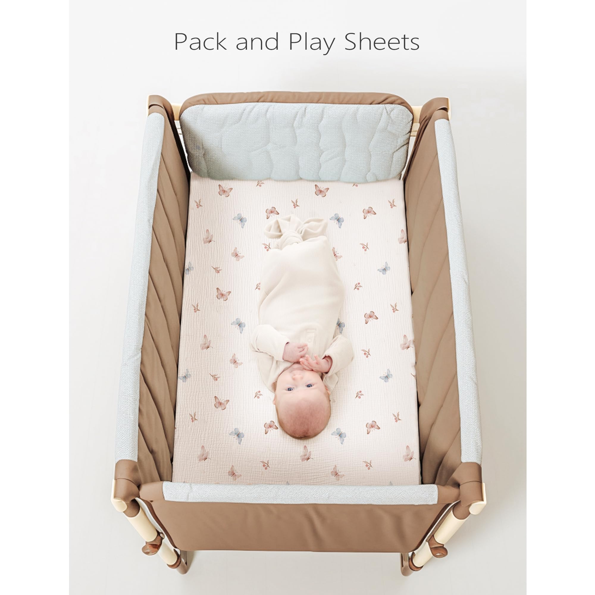 Perfect Fit for Playards & Mini Cribs: Measuring 38 ''x 24 '', Designed to fit most pack n play mattresses, these muslin pack and play sheets fitted stay in place, ensuring a snug and secure fit for your baby’s safety and comfort during rest or playtime
