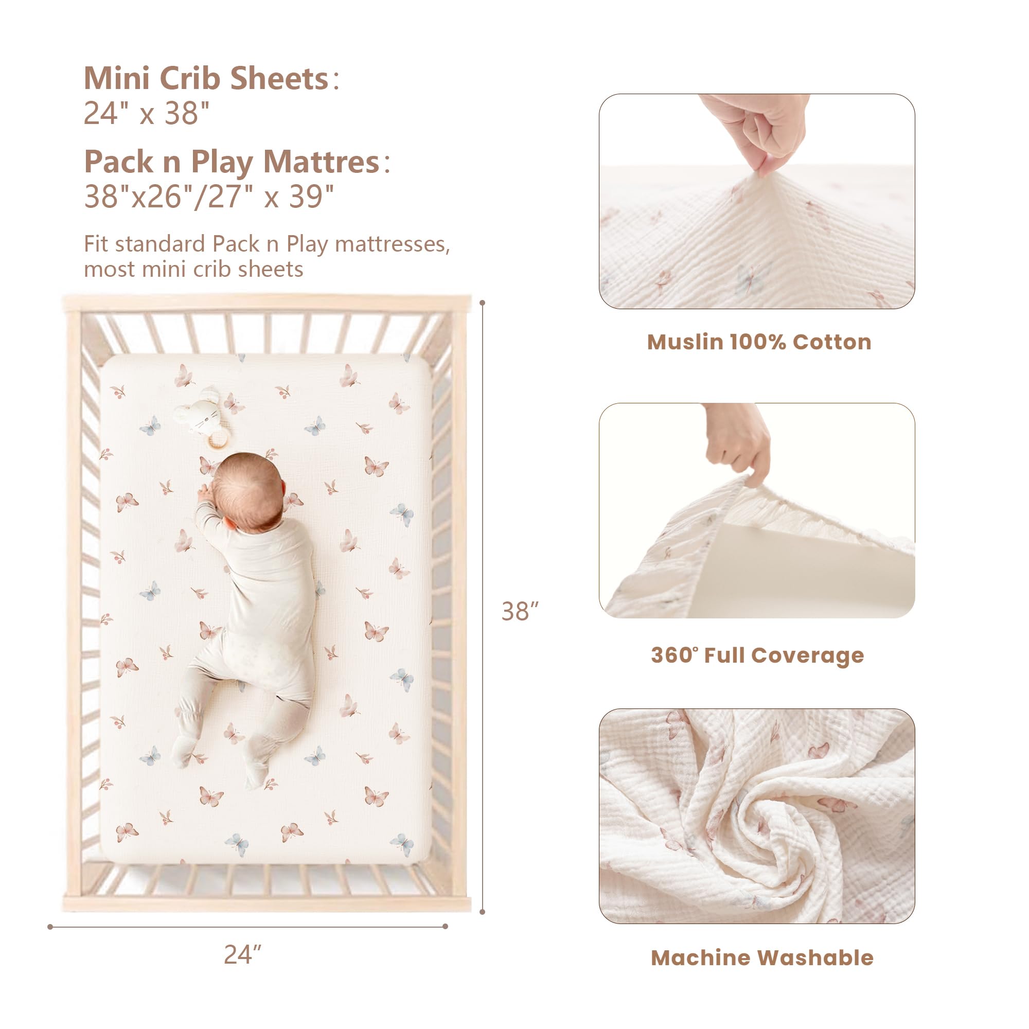 Muslin Mini Crib Sheets, 100% Soft Cotton Pack and Play Sheets for Pack N Play Mattress, Playard Baby Crib Sheets for Baby Girls