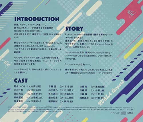 Our life is our art. From DIG-ROCK, the series series series series "Hound ROAR Vol.1 (Houndloak Volume 1)" which was launched by Tim Entertainment Co., Ltd. who planning, producing, and sales of music and drama CDs, launched by Tim Entertainment Co., Ltd. that has been released in the popular original drama CD "Hound Roar Vol.1 (Houndloak Volume One)" and "BRE. Time in NY Introducing Ichtime in New York). This work is based on the "DIGNITY PRODUCTION", which has become a popular Indians band and has gained overwhelming support from young people, and the "Impish Crow" is also known as Incro, which has gained overwhelming support from young people. : General name: Lu. The dramatic CD series depicts the band story of the "Hound Roar" which debuted from the "Renown Stage" and "dice" series. This is a sequel from the previous "dice" series, and the CD "HOUND ROAR Vol.1", which draws the story of Howro, and "BREAK TIME in NYC" that depicts events that are both work and vacation. In "BREAK TIME", new characters are also added, and the Inclo and Rubile's come together together to create a story! "Impish Crow" is an indie rookie band that belongs to the office based on the voice of Manager Takura. Featuring a positive theme that won't give up your dreams, the lyrics from the head of the head and the powerful rock. Abbreviated for Inclo. The band motif is "crow". The cast includes a number of hayama missurpassed talents and vocalist "Tsumi Nonaka (Tsugumi)" and Yuma Uchida, a recognized leader "Loved Leader", guitarist Noruki Mizukawa, Takuya Eguchi, and a "Natural Basist" "Yasuru Hayama (Hayama Misuru)". Wataru No, Outside Kenjin Ito, the manager of Shinnosuke Tachibana and "Unzaku Shibasaki (Tubisaki, Hibari)" from Gosho Juuchi "Poison Tongue" and "Unzaku Shibasaki. "RUBIA Leopard" is a popular band that is proud of live tours, and is a popular music industry. Features vocal lyrics and overwhelming songs, strong and straight thoughts. Abbreviated to "Rubile". The band motif is "Made-colored Leopard". The cast includes Tenka Mujira "Perfect King" and "Sunkuru Akane" from "Higurashi Akane" to "Perfect King" "Vocalist" "Higurashi Akane" and "Shin Furukawa, "Loyal Hardness" Guitarist "Tsuki Kuroko" and "Ishikawa "Misaku Fuyuki Maro)". Takuya, Exploration He started Wataru Komada, a manager who is responsible for Natsuki Hanae and Rubire, from the Drummer "Sumizome Neiji (Sumizome Neiji)" and "Iwara Shiki Iwara Shiki". This is an audition entitled to unravel the new band of "Renown Stage" and is an upcoming band that has won the path of debut unnamely. It expresses the "rock" that is different from the Inclo and Rubile, and features songs that incorporate elements from alternative rock to jazz, classic. The abbreviation is "Howro". The band motif is "Blood Hound of the Hunting Dog". The cast includes Toshiyuki Toyonaga, a vocalist from "Unawareness Genius" and "Vocalist" from "Kono (This cracker)", "Tundelayanke" guitarist "Shobai Tsunderayanke" "Shoubai Endo" and Ryohei Kimura, "Tenma" Brain Free Man "Hayama green) Mitsuka Kawa, the intense "nervous nervous nervous geek" keybodist "Ri Ono, Uziro Umehara, "Chiro Ono no no no no no no no Taisa" "Drummer Shooto (Kado Sogo)", the manager who is responsible for Howro "Takahi" Kaga Kasui. Recognized by Tetsuke Haki for In addition, as a new character of "BREAK TIME in NY", the father of the Akadeki Higurashi Takaki" (CV. Hiroki Tochi). Together, the brother "Emperor Higurashi Mikado" (CV.Daisuke Ono) and "Higurashi Kaede" (CV.Satoshi Hino), and "Satoshi Hino), are now available to bring a luxurious story in New York. Like the previous series, each band includes new songs as well. The series is enhanced with overwhelming song power and new songs by Tsugumi (CV, Uchida), Akane (CV, Shin Furukawa), and Hibiki (CV. Toshiyuki Toyonaga). Continuing to the previous work, the director of the same label, "A's x Darling", "AD-Fresh", "Otomay Record" "Love Color" and "Kunkoi Signal", the scenario