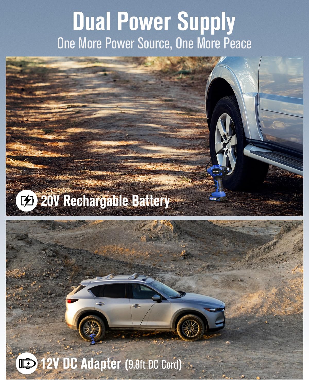 [Dual Power Supply for Maximum Flexibility] Powered by a 20V rechargeable Li-ion battery or a 12V DC adapter (with a 9.8ft cord), this portable tire inflator for car gives you options. Never stress about a dead battery on the road—just plug it into your car’s 12V outlet for uninterrupted use. Perfect for roadside emergencies