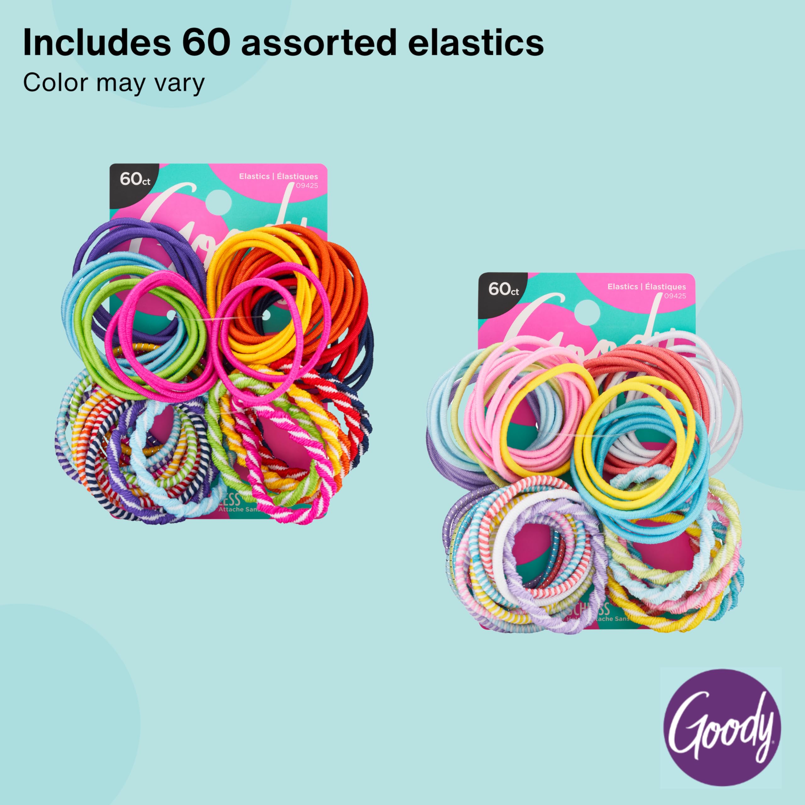 Goody's Kids Ouchless Elastic Hair Ties Goody's Kids Ouchless Hair Ties are designed for maximum comfort and ensure that you can wear your favorite hairstyles all day long without any discomfort and helps prevent hair breakage. These hair ties have a gentle, secure, no-damage hold that lets you style your hair without pulling or snagging, ensuring it stays in place and out of your face. These 2MM ponytail holders easily stretch to accommodate fine to medium hair, without fallling off. Designed for young girls and boys, these cute, trendy accessories are great for women and men of all ages. Keep one on your wrist so you have it ready for when you need it. Suitable for school, play, work, exercise, yoga, shopping, travel and daily wearing. You will receive 1 of the 3 assortments - assorted brights, assorted rainbows, or assorted pastels. Bringing style and innovation to your accessory game, Goody believes that fun and function are not mutually exclusive. Goody is with you for every moment of every day with bright prints, patterns, and fashion accessories to step up your game and never-fail essentials for styles that last. Because Goody knows, one little accessory can change everything.