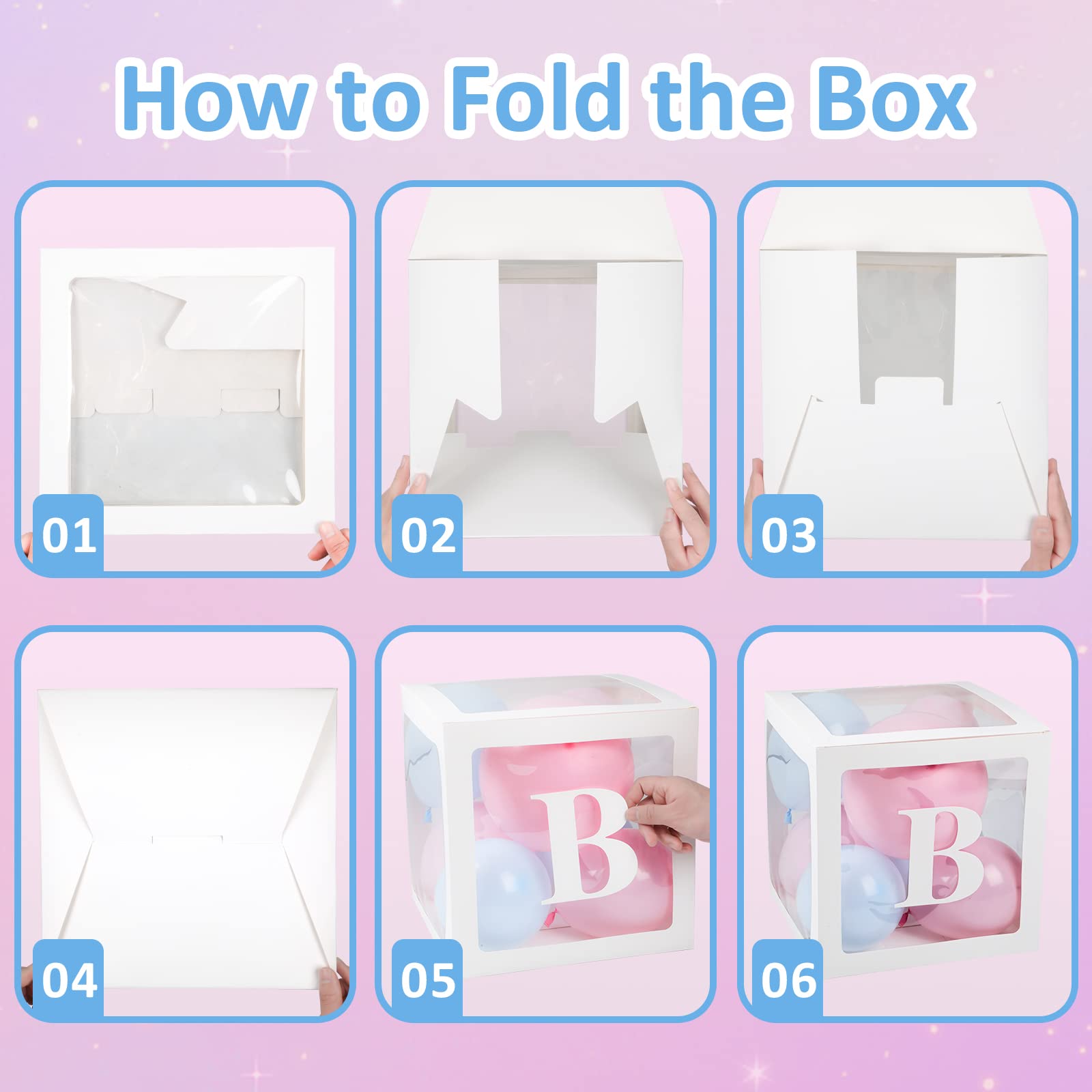 Easy to Assemble: According to the introduction in our product picture, firstly fold baby box, secondly use adhesive dots to paste the letter you want to the center of the transparent window, finally the balloons are putted into the box. You only need to spend 5 minutes, your party becomes easier