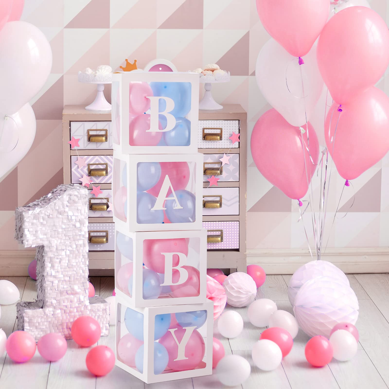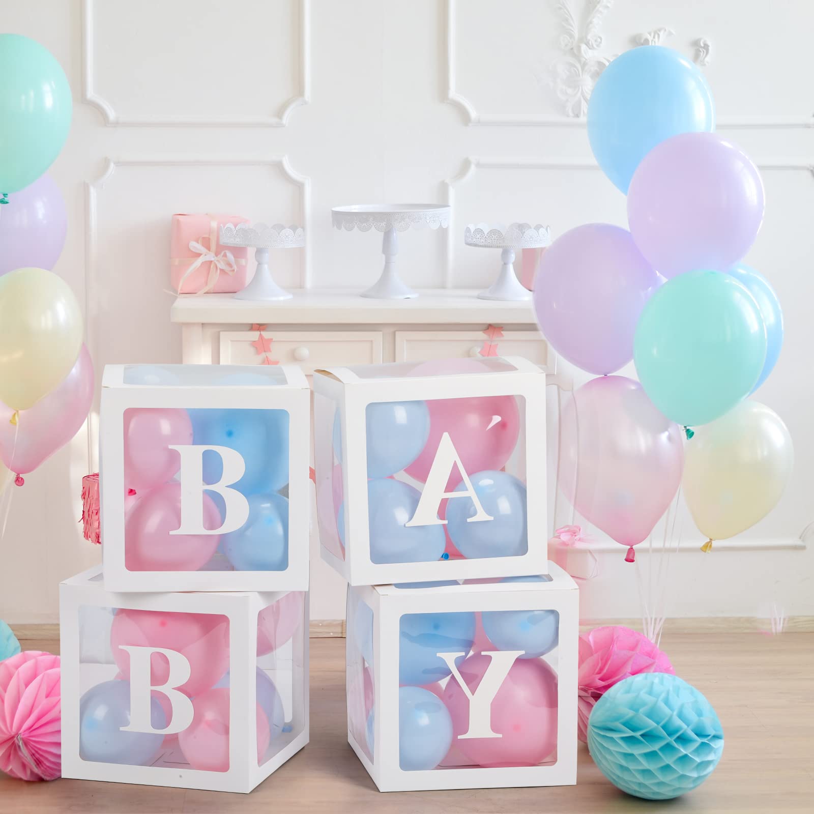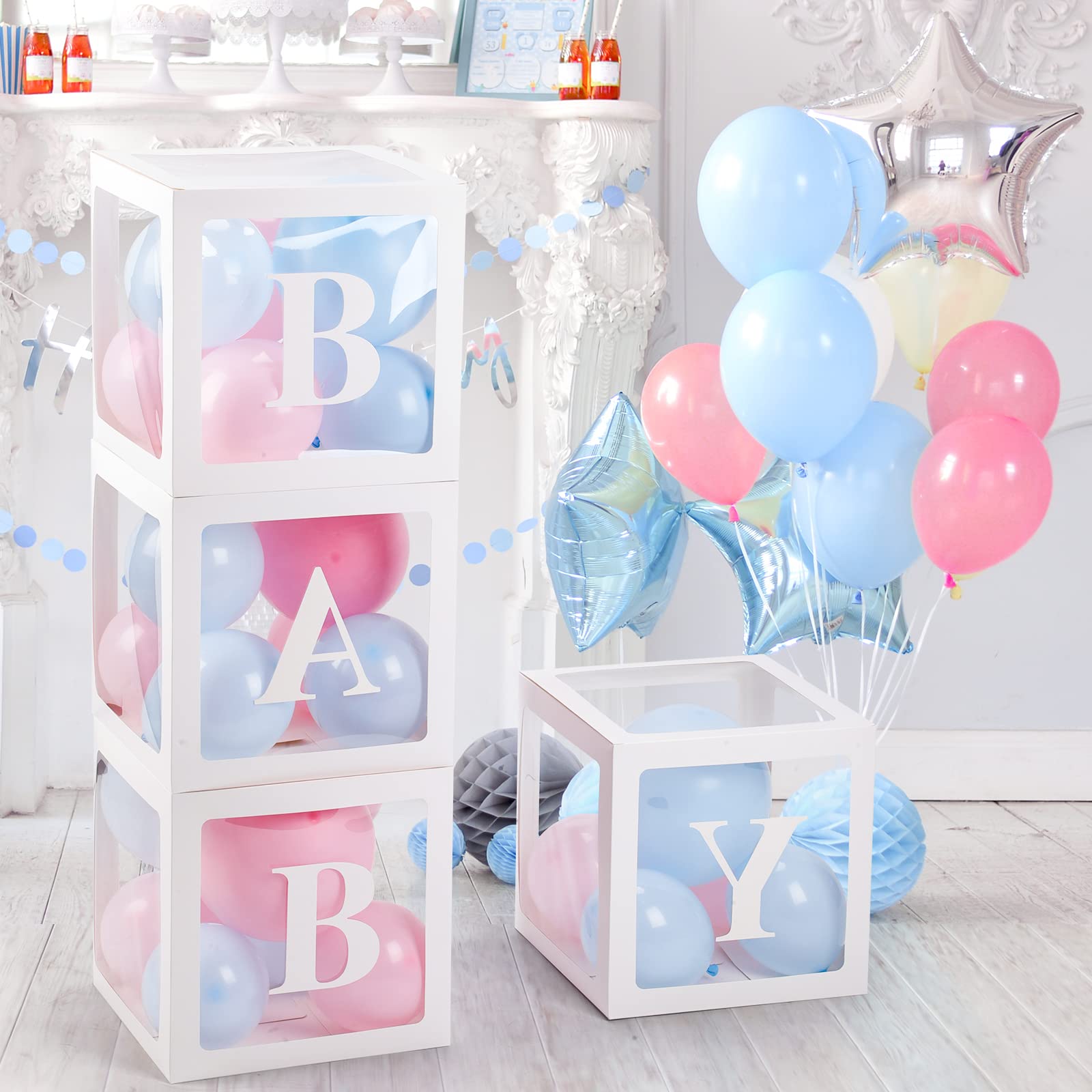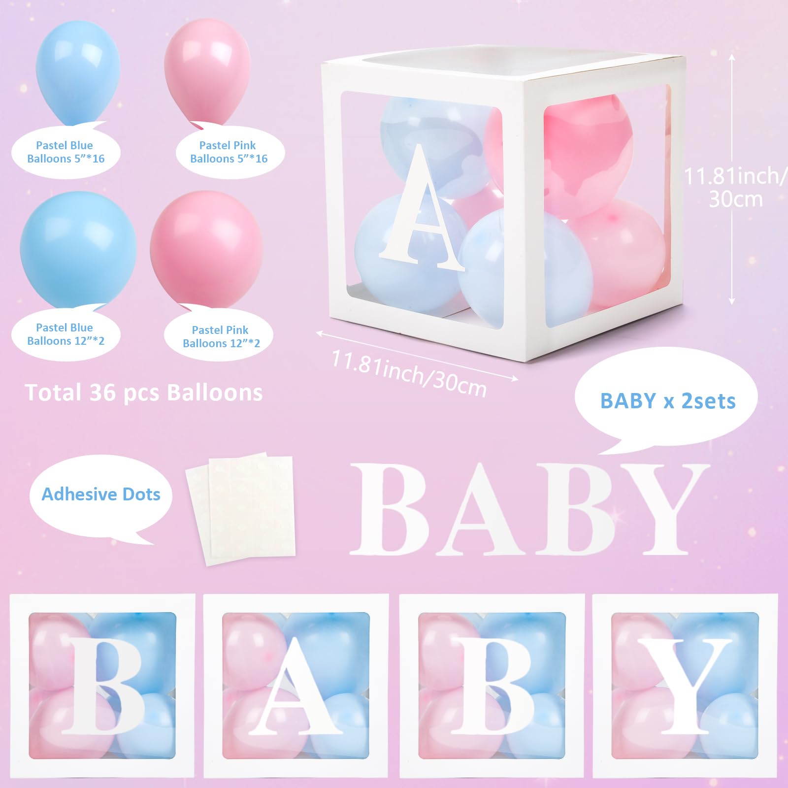 Package Included: Voircoloria DIY transparent balloon boxes set includes 4pcs clear balloon boxes, 2set BABY letters,36pcs blue pink balloons and 2set adhesive dots