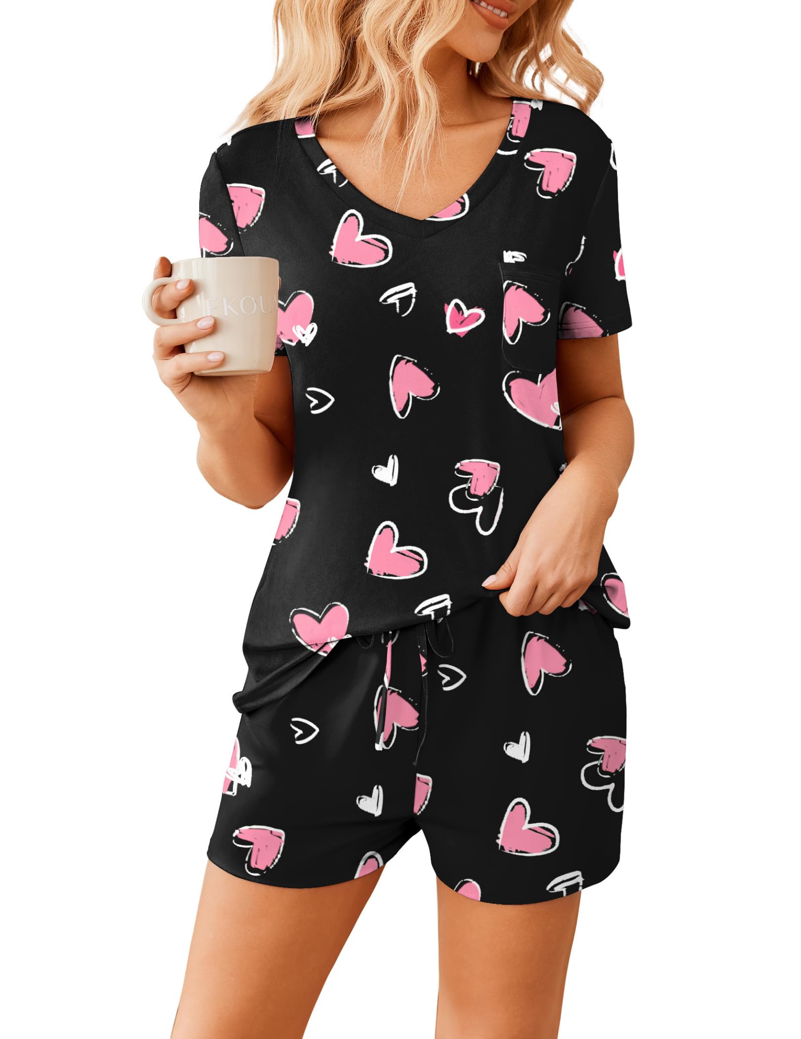 FEATURES: pajama sets for women 2 piece, pj sets for woman, V neck women's pajama sets, short sleeve T-shirt, drawstring elastic waist shorts.